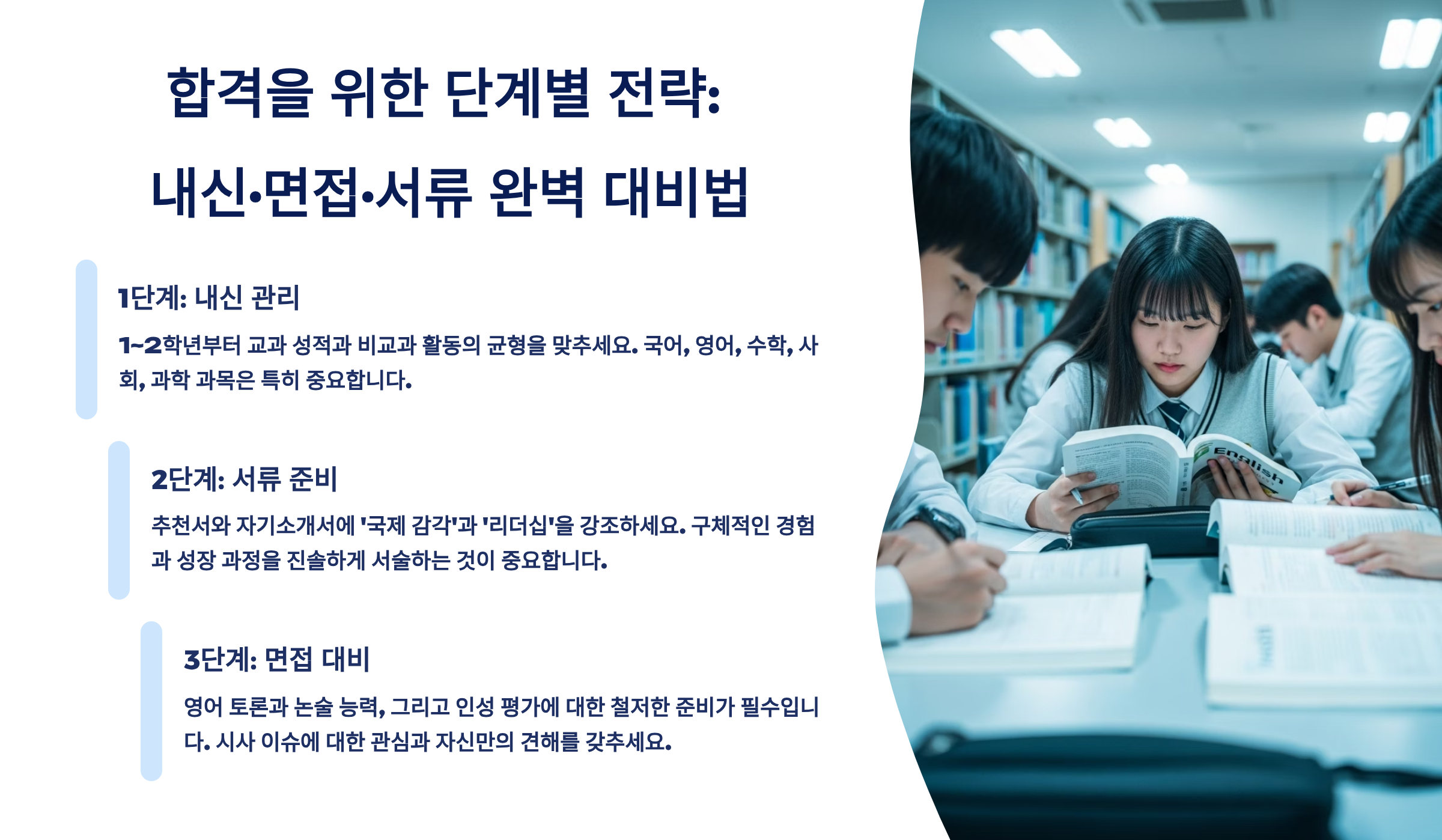 합격을 위해서는 철저한 준비가 필요해요. 영어 내신 올A는 기본이고, 국어와 사회 성적도 우수해야 한답니다. 출결 관리도 소홀히 해서는 안 되고, 자기소개서는 구체적이고 진정성 있게 작성해야 해요. 무엇보다 면접이 당락을 결정하는 만큼, 충분한 연습과 준비가 필수랍니다.