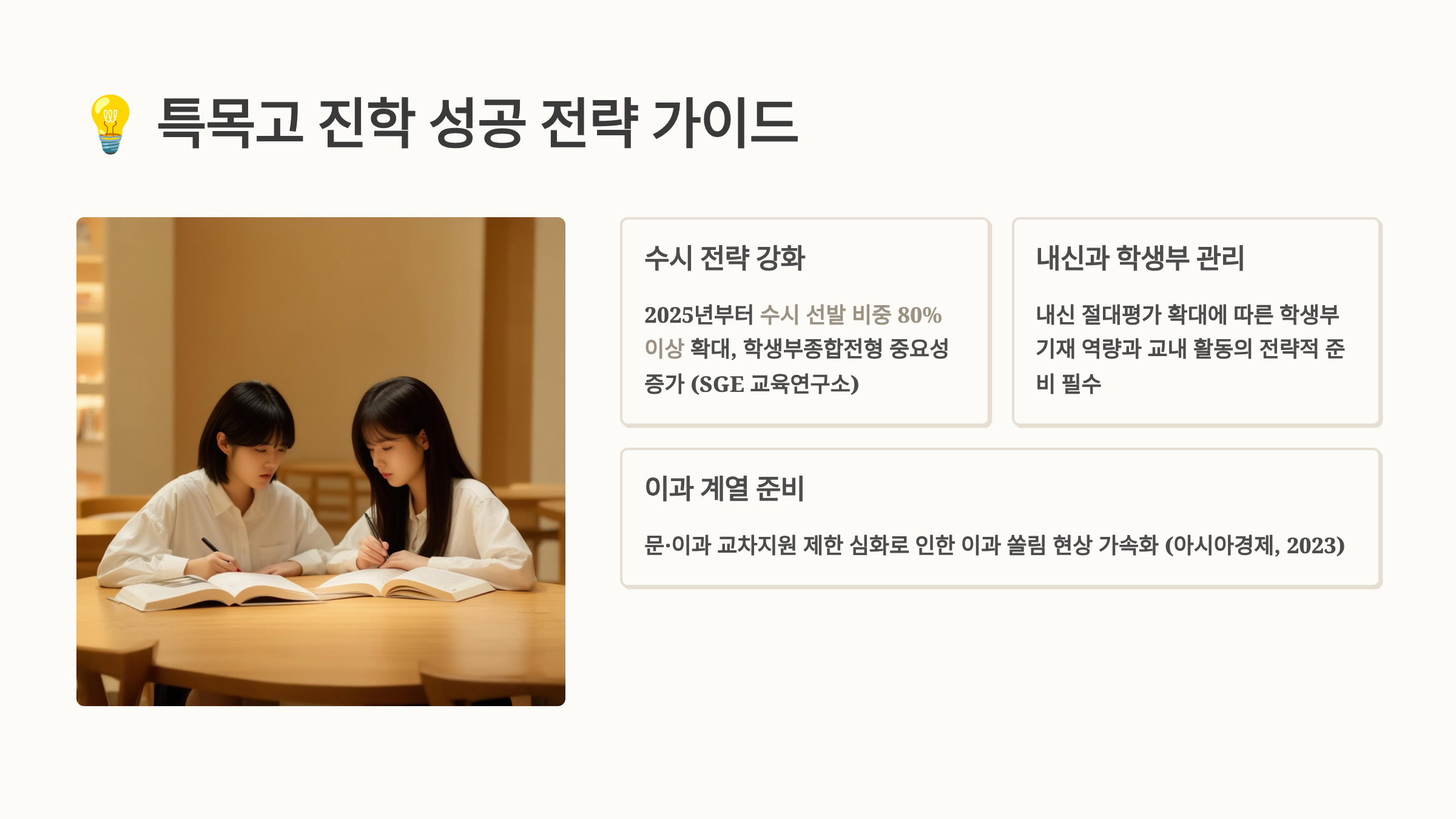 하지만 특목고가 가진 장점도 여전히 존재해요! 심화 교육과정, 우수한 교사진, 동기부여가 되는 또래 집단, 풍부한 교내 활동 기회 등은 일반고에서 얻기 힘든 자산이에요. 특히 학생부 종합전형에서는 이런 활동들이 여전히 중요한 평가 요소가 되고 있답니다. 면접의 비중이 커진 것도 특목고 학생들에게는 기회가 될 수 있어요.