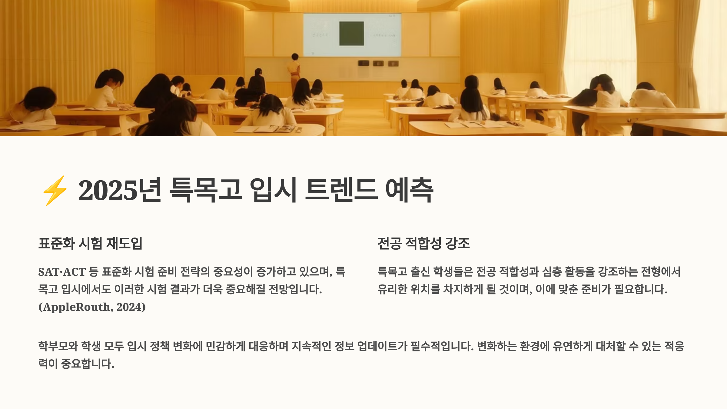 2025년 특목고 입시는 더욱 큰 변화를 맞이할 예정이에요! ⚡ 고교학점제 전면 시행으로 일반고에서도 심화 과목을 선택할 수 있게 되면서, 특목고만의 교육과정 우위가 약화될 거예요. 하지만 특목고의 브랜드 가치와 우수한 교육 환경은 여전히 매력적이기 때문에 경쟁률은 유지될 것으로 보여요.