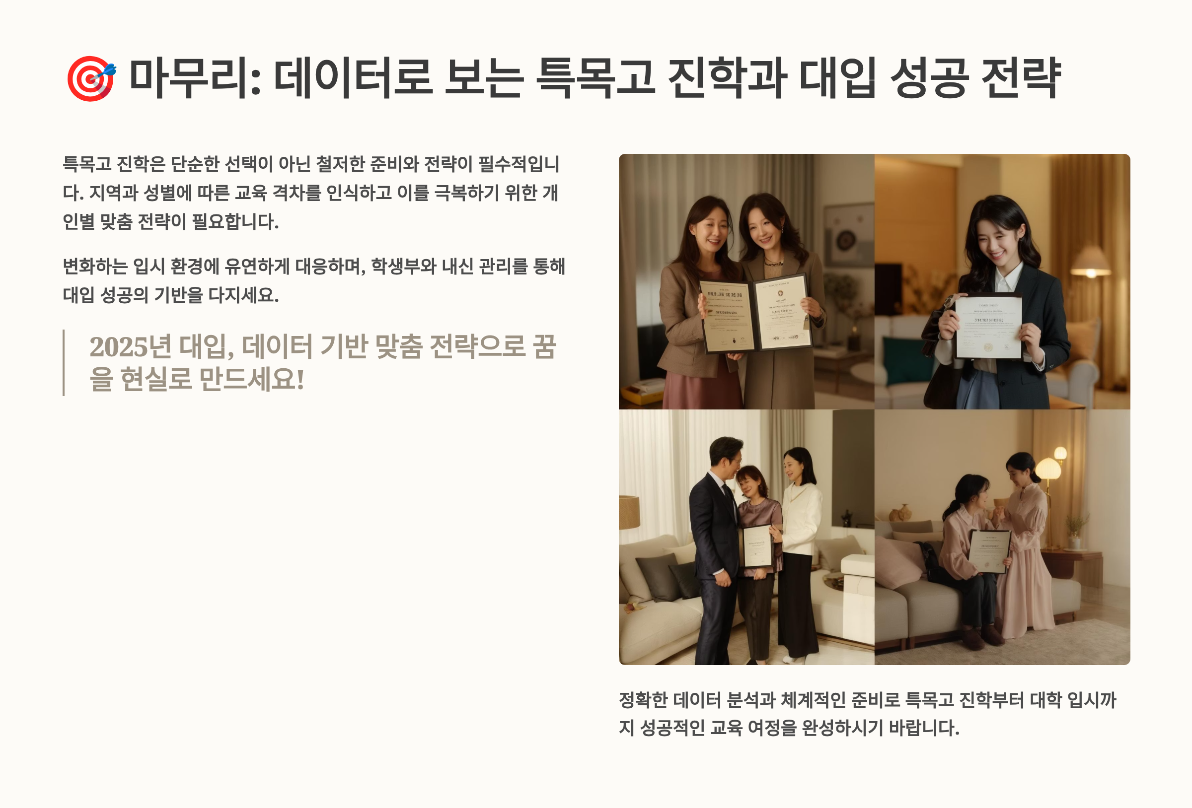 마지막으로 학부모님들께 드리고 싶은 말씀이 있어요. 아이의 적성과 희망을 존중해주세요. 특목고가 모든 아이에게 정답은 아니에요. 아이가 행복하게 성장할 수 있는 환경을 선택하는 것이 가장 중요해요. 입시는 인생의 한 과정일 뿐, 전부가 아니라는 걸 기억해주세요! 우리 아이들의 밝은 미래를 응원합니다! 🌈✨