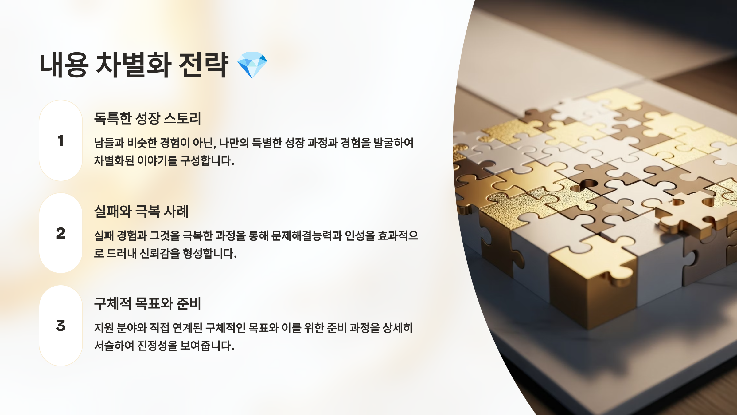 수백 명의 지원자 중에서 돋보이려면 차별화된 내용이 필수예요! 단순한 사실 나열이 아니라 '나만의 이야기'를 담아야 해요. 제가 아이와 함께 브레인스토밍하면서 발견한 차별화 전략을 소개할게요. 평범한 경험도 특별하게 만드는 마법 같은 방법이에요! 🌟