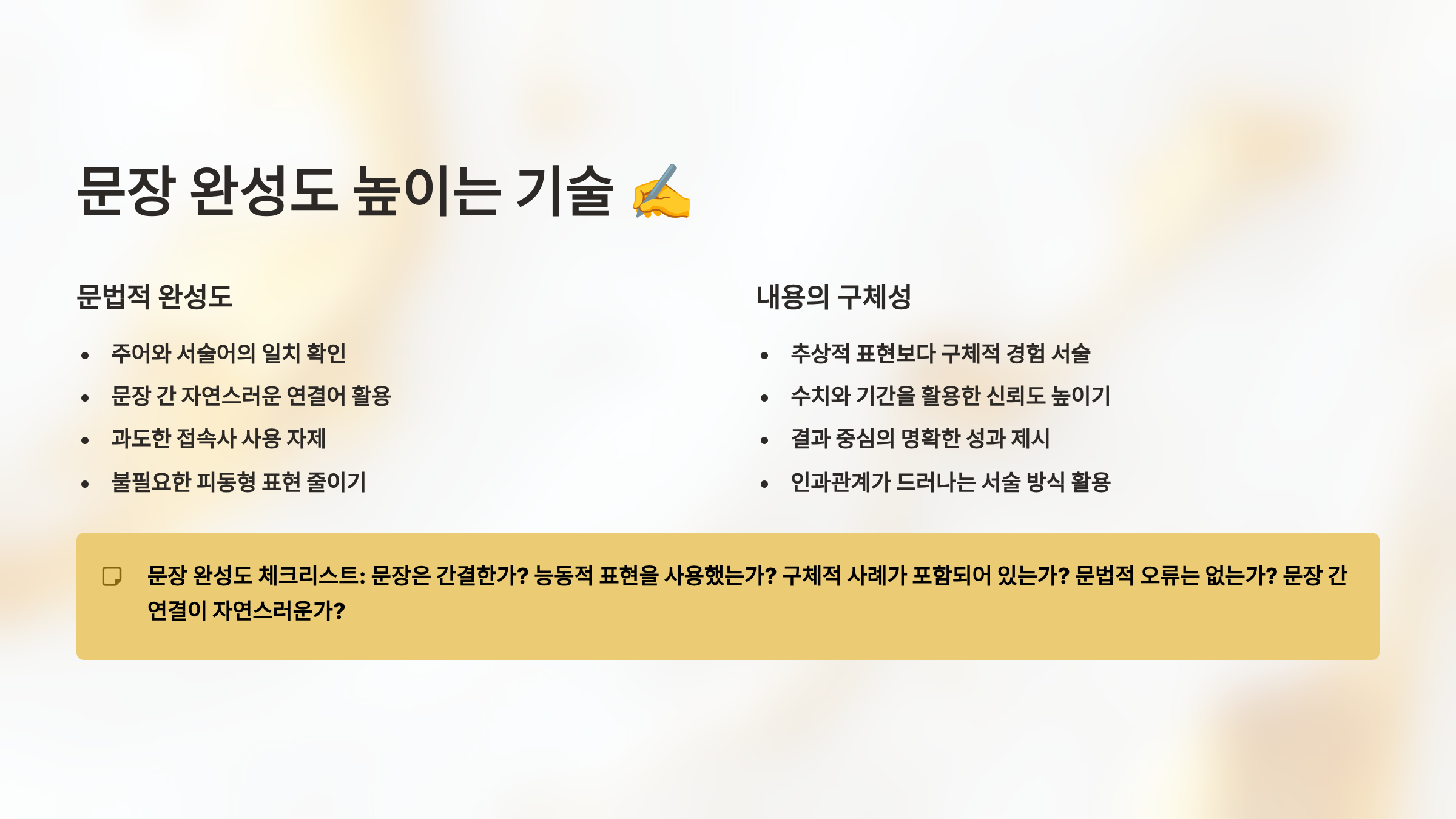 두 번째는 '능동태 사용하기'예요. "선생님께 칭찬을 받았습니다"보다는 "선생님의 칭찬을 이끌어냈습니다"가 더 주도적으로 보여요. "문제가 해결되었습니다"보다는 "문제를 해결했습니다"가 더 강한 인상을 줘요. 작은 차이지만 전체적인 인상이 완전히 달라진답니다!