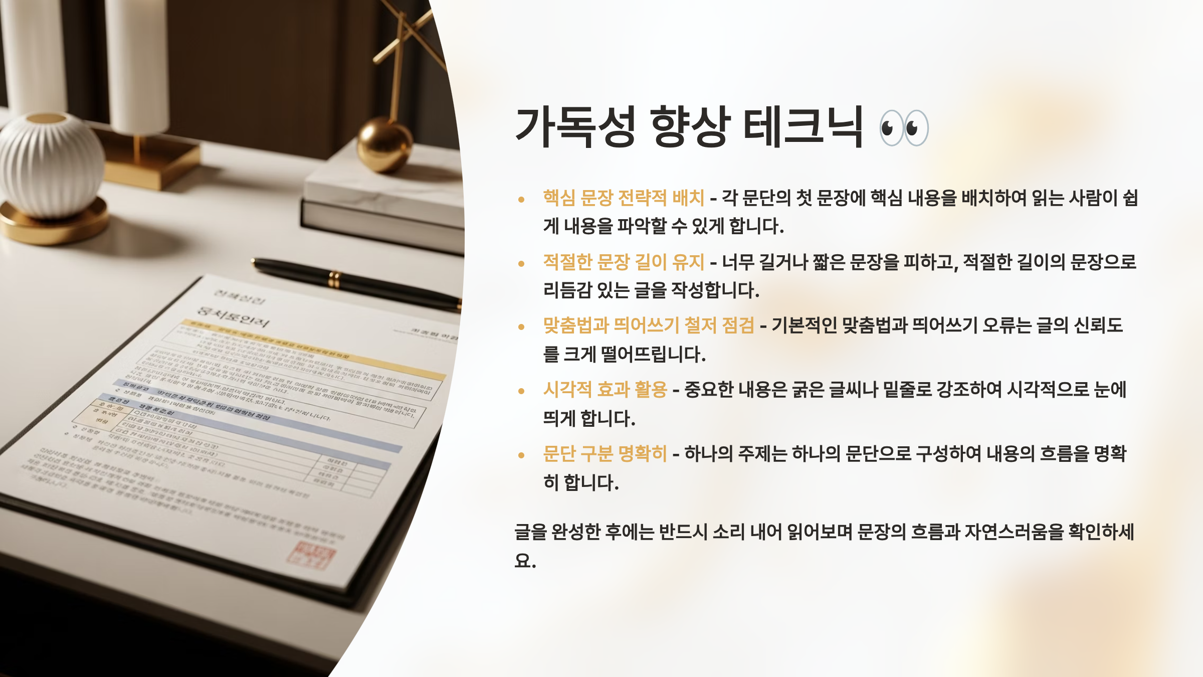 첫 번째는 '적절한 문단 나누기'예요. 한 문단은 5-7줄을 넘지 않도록 하세요. 너무 긴 문단은 읽는 사람을 지치게 만들어요. 하나의 문단에는 하나의 핵심 메시지만 담고, 문단과 문단 사이는 자연스럽게 연결되도록 하세요!
