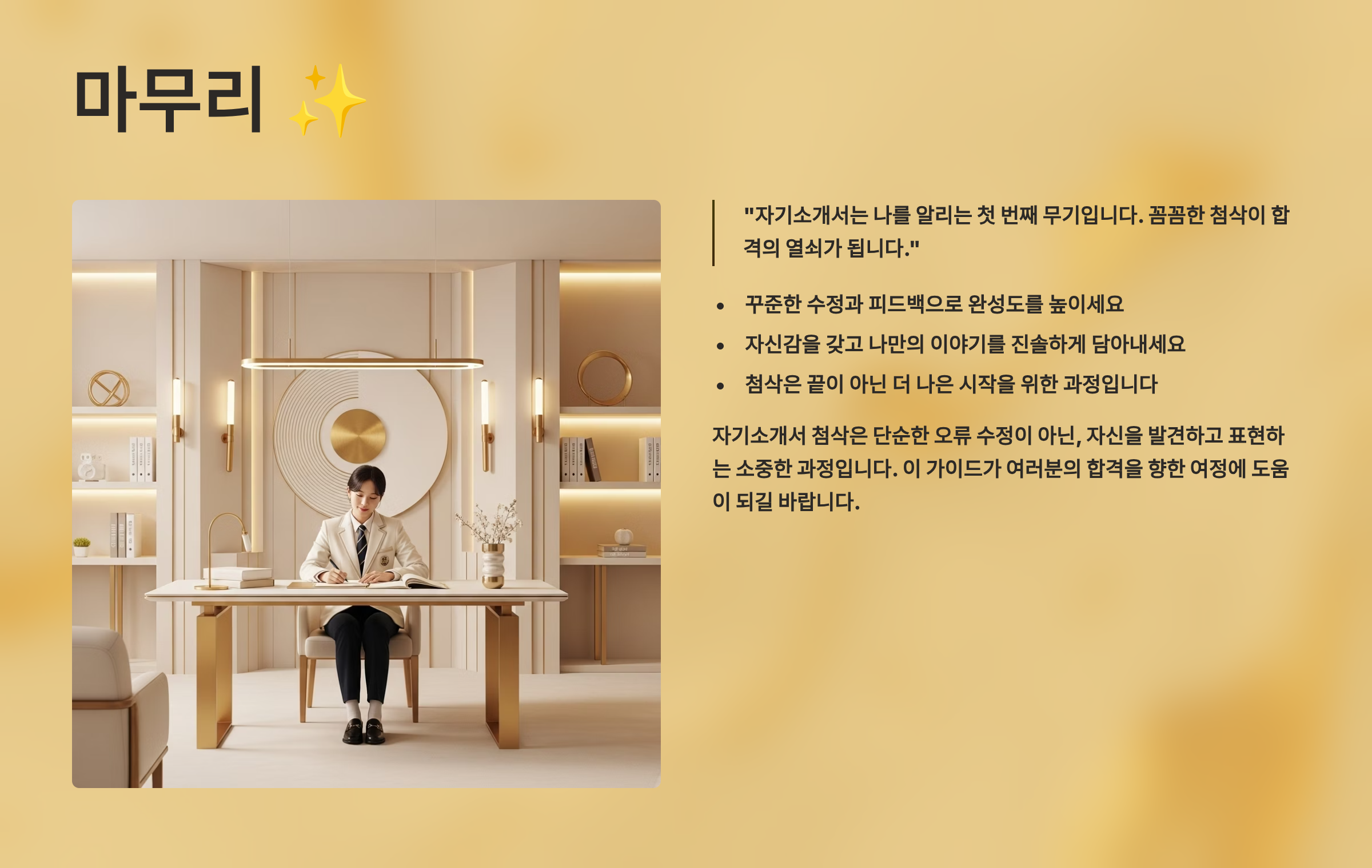 마지막으로, 완벽한 자소서는 없다는 걸 기억하세요. 최선을 다했다면 그것으로 충분해요. 자소서 작성과 첨삭 과정 자체가 아이에게는 큰 배움이 되고, 부모님과 함께하는 소중한 시간이 될 거예요. 여러분의 도전을 진심으로 응원합니다! 화이팅! 🎓