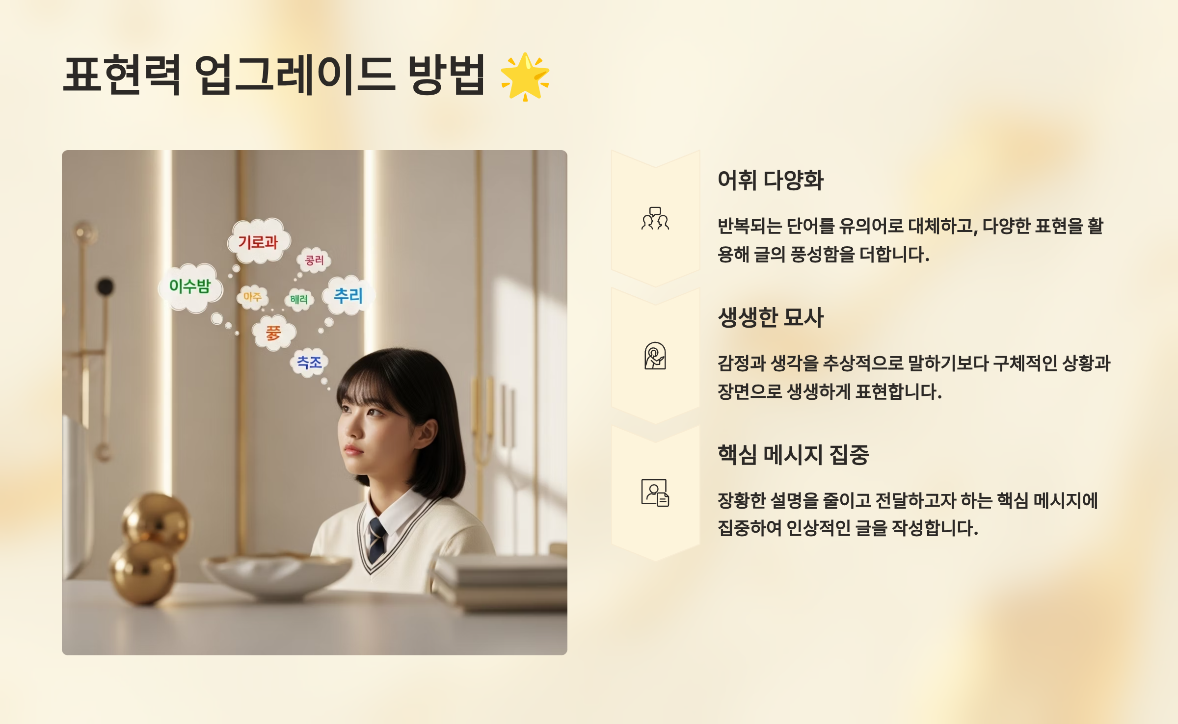 첫 번째는 '감각적 표현 활용하기'예요. "힘들었다"보다는 "온몸이 땀으로 젖었다", "기뻤다"보다는 "심장이 빠르게 뛰었다"처럼 오감을 활용한 표현을 쓰면 생생함이 살아나요. 평가자가 그 순간을 함께 경험하는 느낌을 받게 됩니다!
