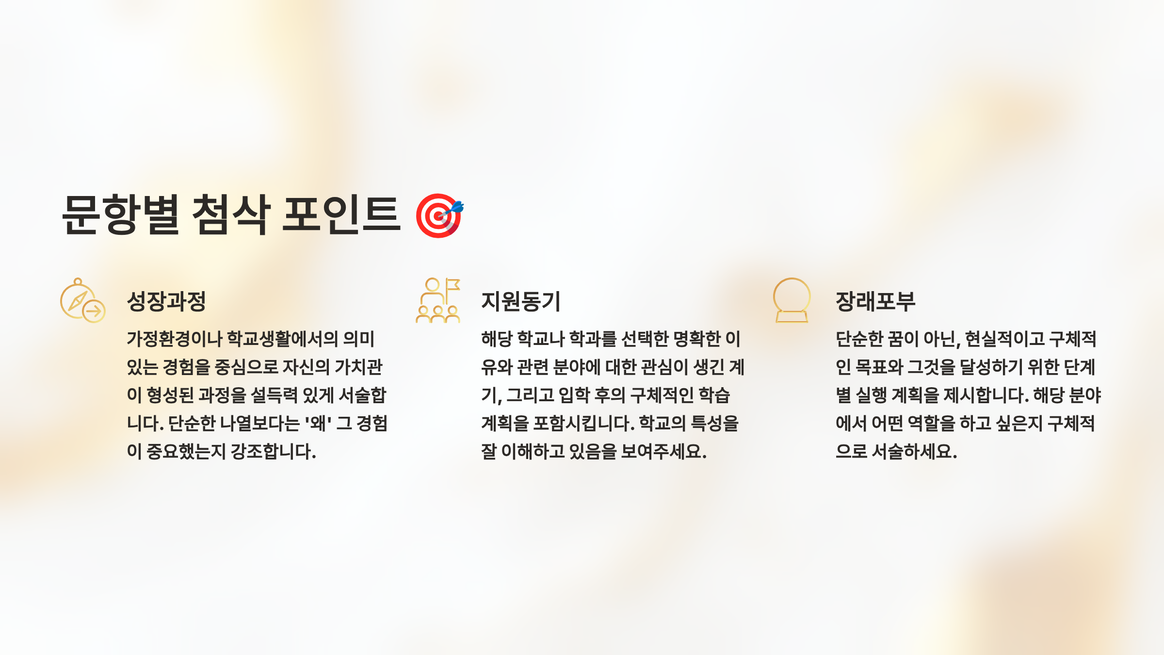 각 문항마다 평가자가 보고 싶어 하는 포인트가 달라요! 지원동기, 학업계획, 인성 등 문항별로 어떻게 접근해야 하는지 구체적으로 알려드릴게요. 제가 여러 학교의 자소서를 분석하면서 발견한 합격 패턴을 공유합니다! 🎯