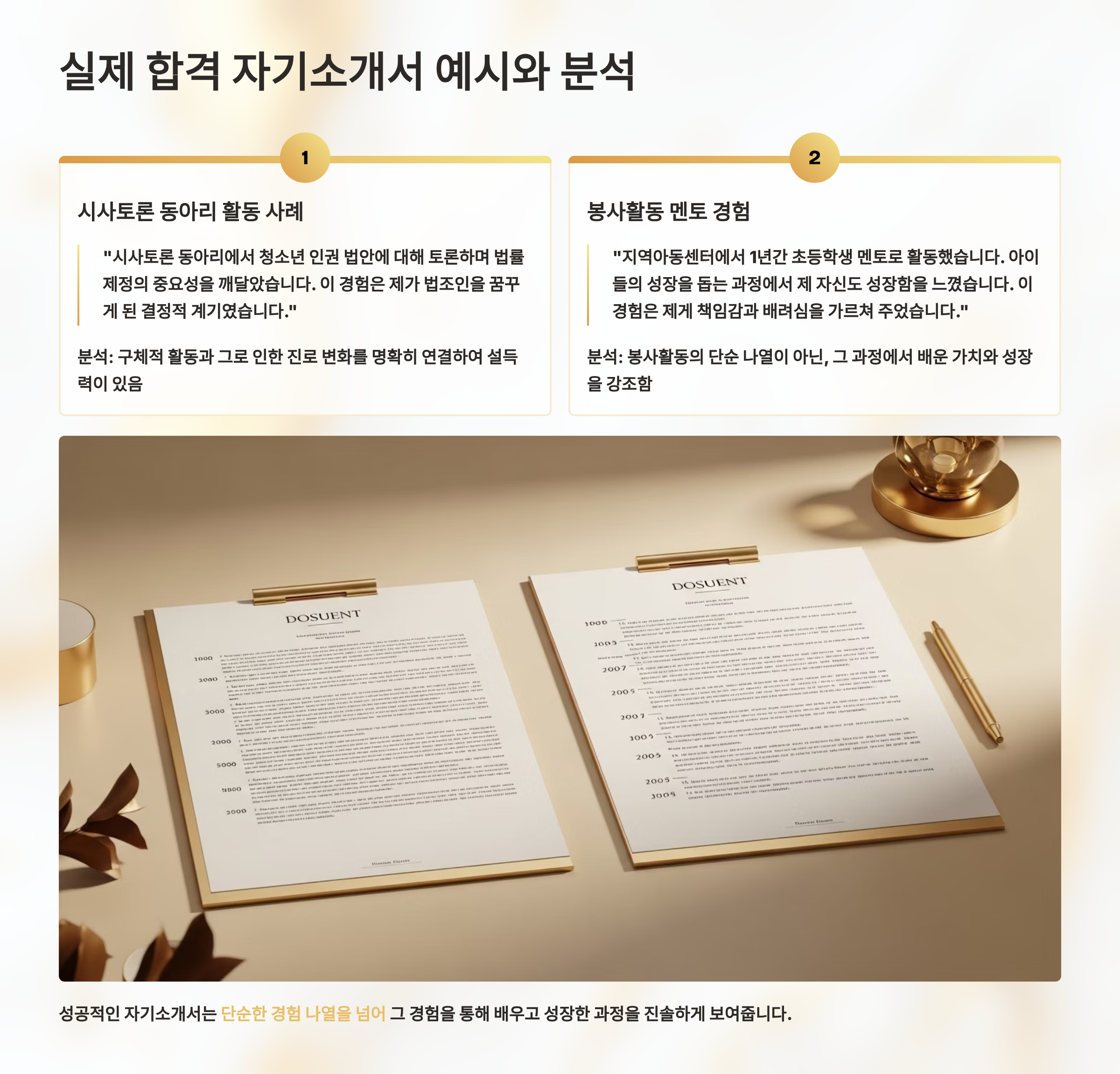 실제 합격생들의 자기소개서를 분석해보면 몇 가지 공통된 특징을 발견할 수 있어요. 첫째, 구체적인 에피소드를 통해 자신의 성장 과정을 보여줘요. 둘째, 학교 지원 동기가 명확하고 입학 후 계획이 구체적이에요. 셋째, 자신만의 독특한 관점이나 경험을 효과적으로 어필해요. 이제 실제 예시를 통해 자세히 살펴볼게요.