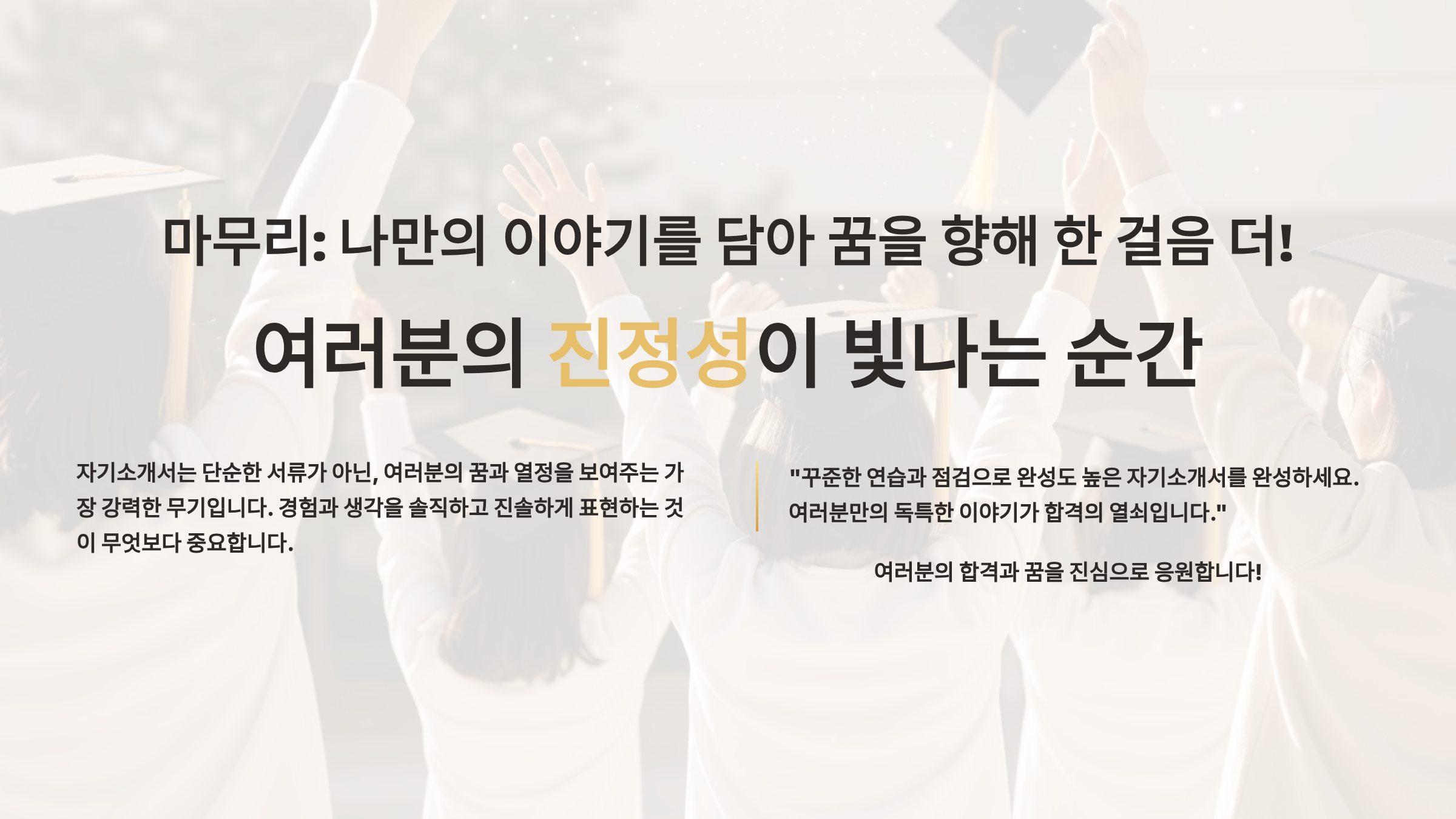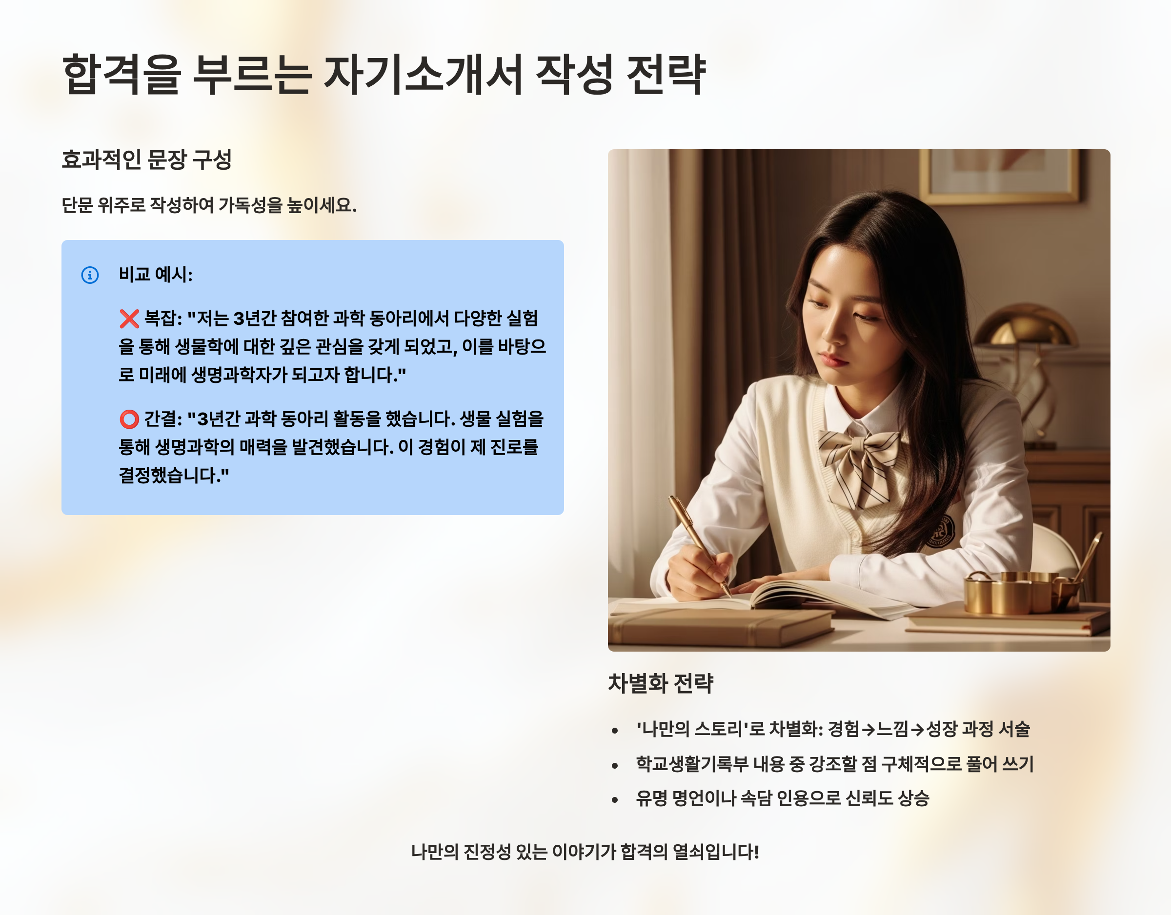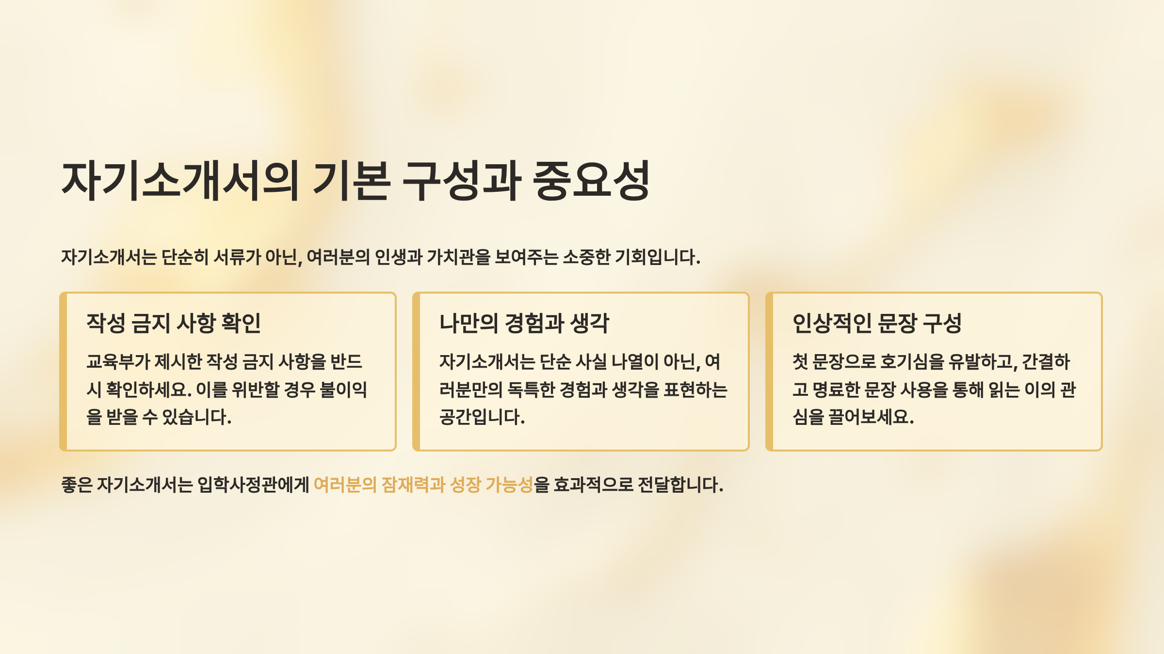 자기소개서는 단순한 글쓰기가 아니라 나를 표현하는 가장 중요한 도구예요. 성적표나 생활기록부로는 보여줄 수 없는 나만의 이야기, 열정, 그리고 잠재력을 담아내는 공간이랍니다. 이 글을 통해 여러분도 합격의 기쁨을 누릴 수 있는 자기소개서를 완성해보세요!