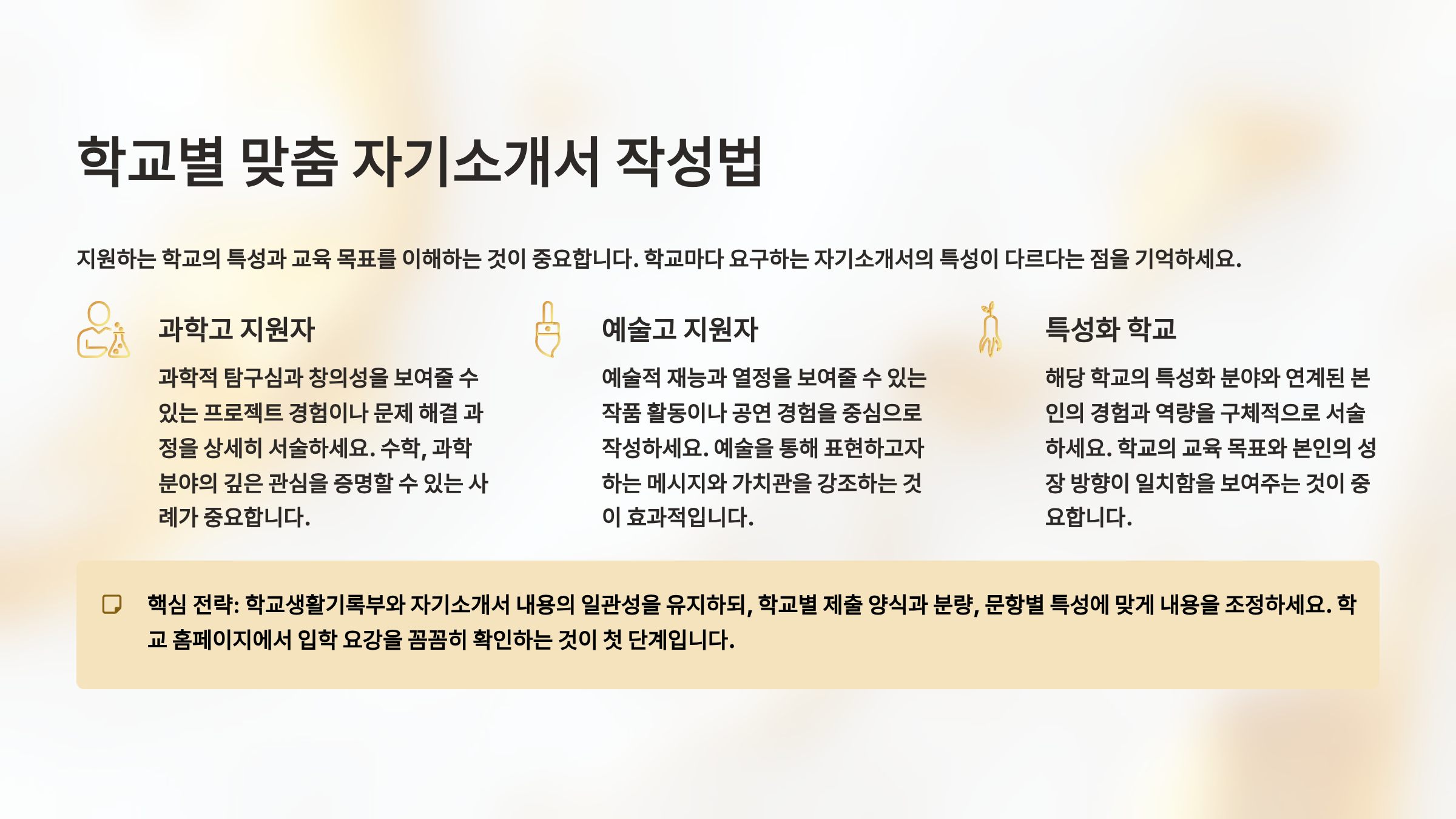 학교별 인재상을 파악하고 이에 맞춰 자기소개서를 작성하는 것도 중요한 전략이에요. 각 학교 홈페이지나 입학 설명회 자료를 통해 학교가 추구하는 가치와 교육 목표를 확인하세요. 예를 들어 과학 중점 학교라면 과학적 탐구 경험을, 국제화 특성화 학교라면 글로벌 역량을 강조하는 것이 유리해요.