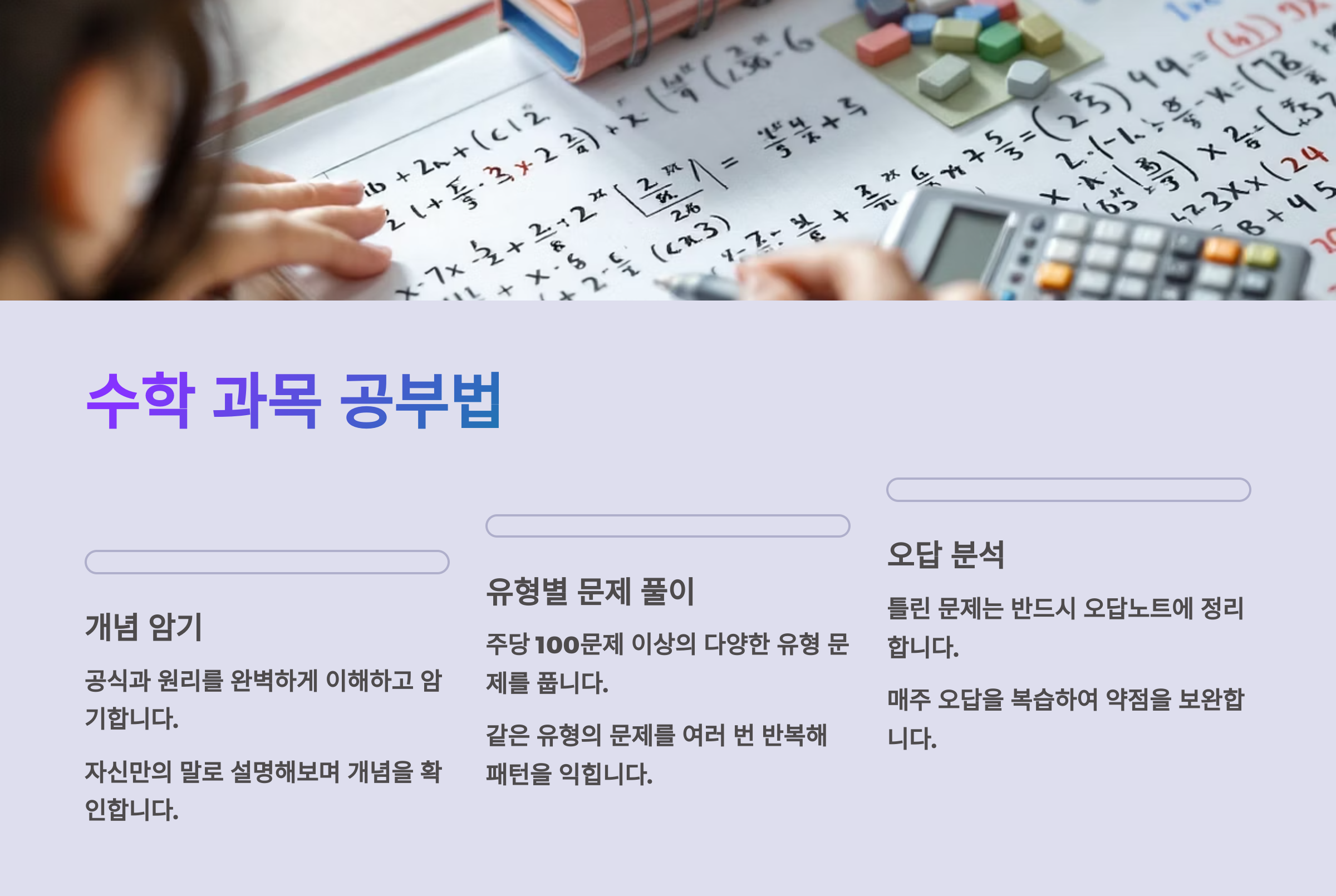 📌 첫 번째 전략은 개념 이해를 선행보다 깊게!예요. 문제만 푸는 식으로 접근하면 절대 실력이 늘지 않아요. 반드시 교과서 개념을 직접 노트에 정리하면서, 내가 설명할 수 있을 정도로 소화해야 해요. 이해 없이 문제 풀기는 무의미해요.