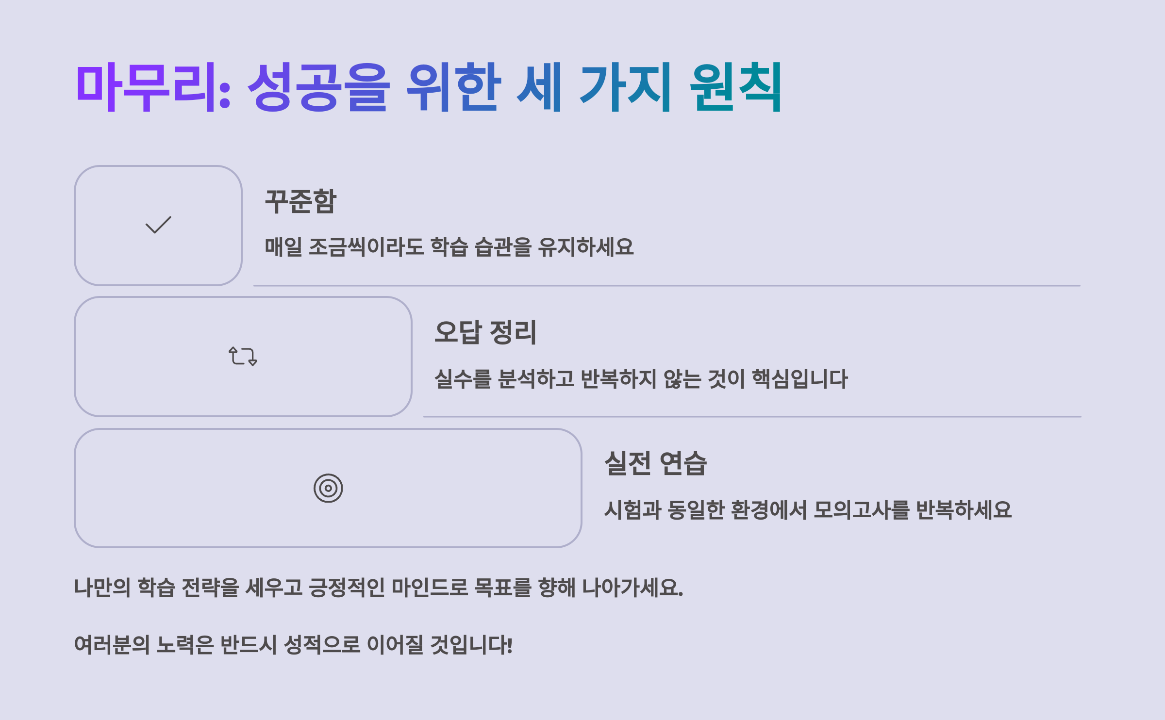 📝 두 번째 전략은 문제풀이 ‘3단계 반복’이에요. (1) 개념 확인 → (2) 기본 문제 → (3) 응용 문제 순서로 꾸준히 반복하세요. 단원별로 유형을 구분해서, 틀린 문제는 반드시 오답노트에 풀이 과정까지 써보는 연습이 필요해요.