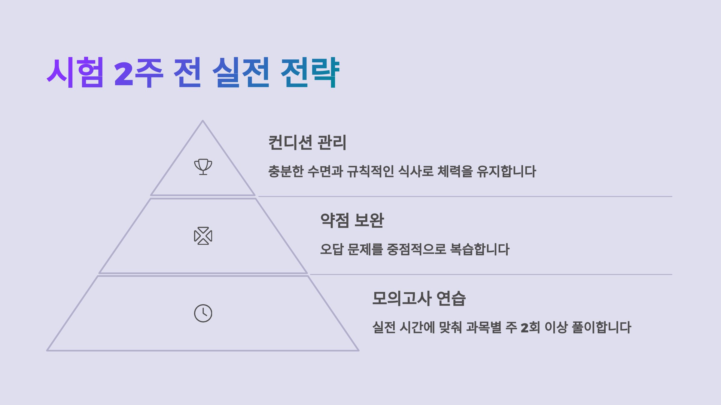 📅 시험 2주 전은 정리 + 점검 + 연습의 시기예요. 이때는 새로운 걸 공부하기보다는 이미 배운 내용을 ‘확실히 내 걸로 만드는 작업’이 핵심이에요. 복습 전략을 세워야 하고, 시간 배분을 잘 해야 해요. 특히 ‘교과서 중심’으로 다시 돌아와야 할 타이밍!