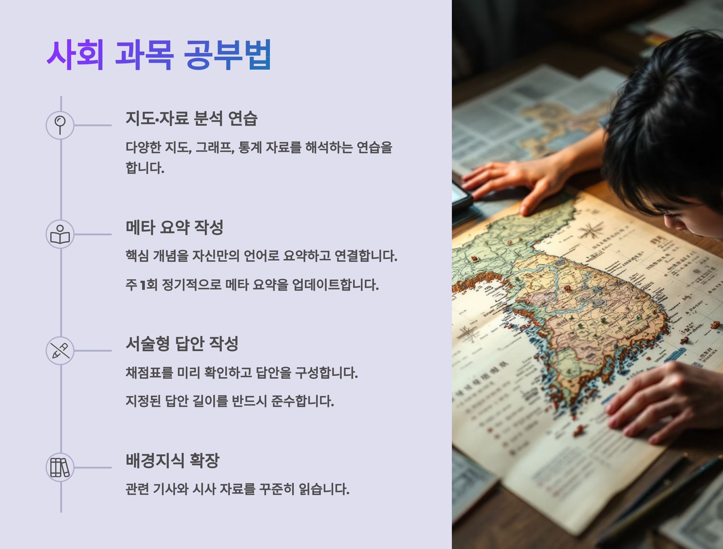 📌 두 번째 전략은 지도, 표, 그래프 해석 훈련이에요. 사회는 단순 설명만이 아니라 시각 자료 문제도 매우 자주 출제돼요. 위치 찾기, 통계 비교, 그래프 분석 같은 유형은 반드시 문제 풀이 경험을 쌓아야 해요.