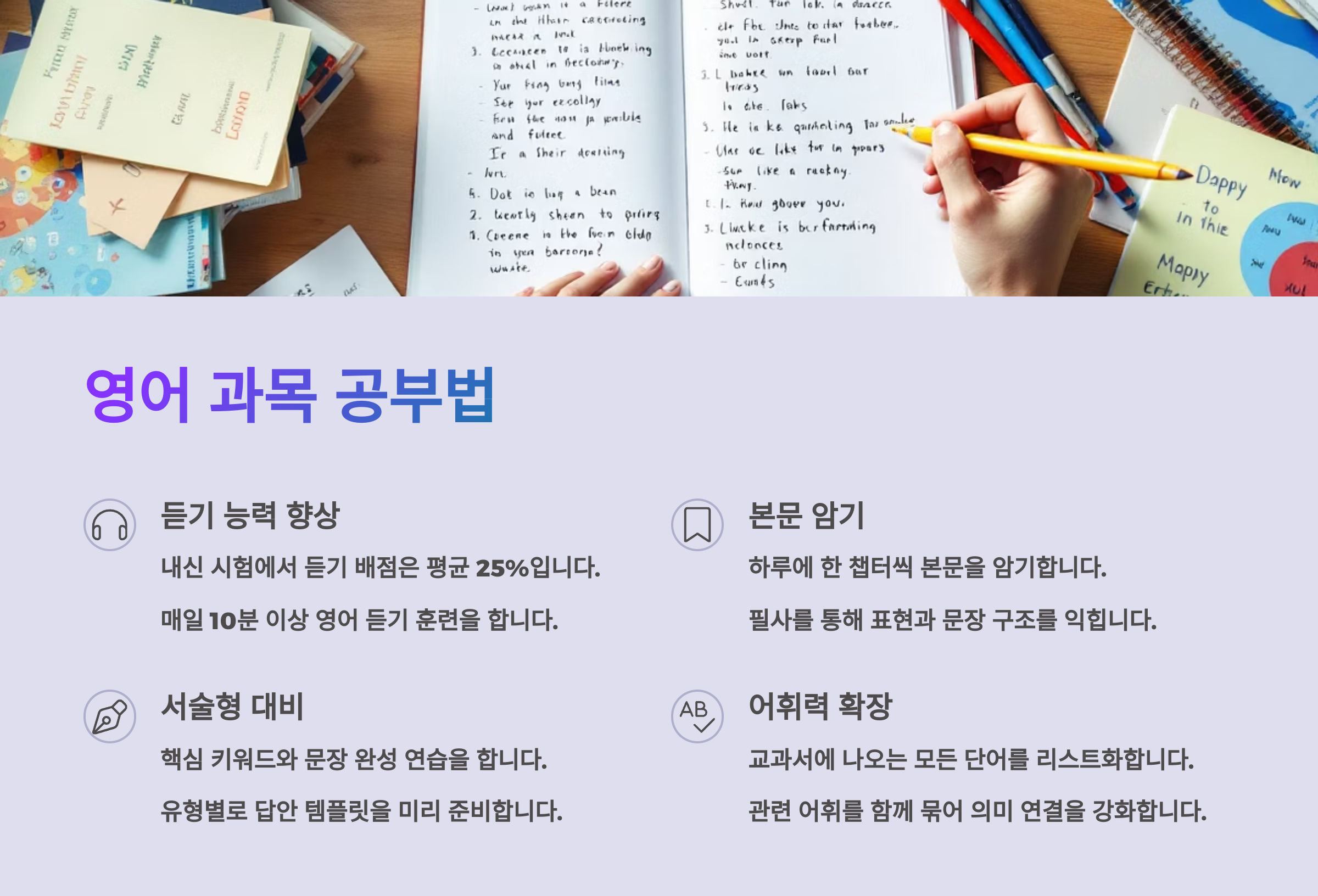📚 두 번째 전략은 지문 따라쓰기 + 암송이에요. 듣고 쓰고 말하기가 동시에 들어가면 영어 문장이 머리에 딱 박혀요. 교과서 한 단락씩 소리 내어 읽고, 받아쓰고, 눈 감고 외우기까지 하면 문법 + 어휘 + 표현력을 한꺼번에 잡을 수 있어요.