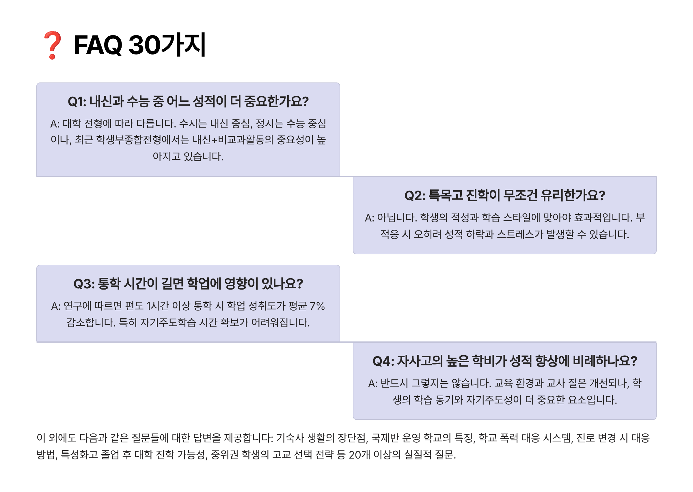 3년 후 대입까지 고려한 장기적 관점이 필요해요. 🎓 단순히 고등학교 3년만 생각하지 말고, 대학 입시와 연계해서 생각하세요. 목표 대학과 학과, 선호하는 전형을 고려해서 가장 유리한 환경을 선택하는 게 중요해요!