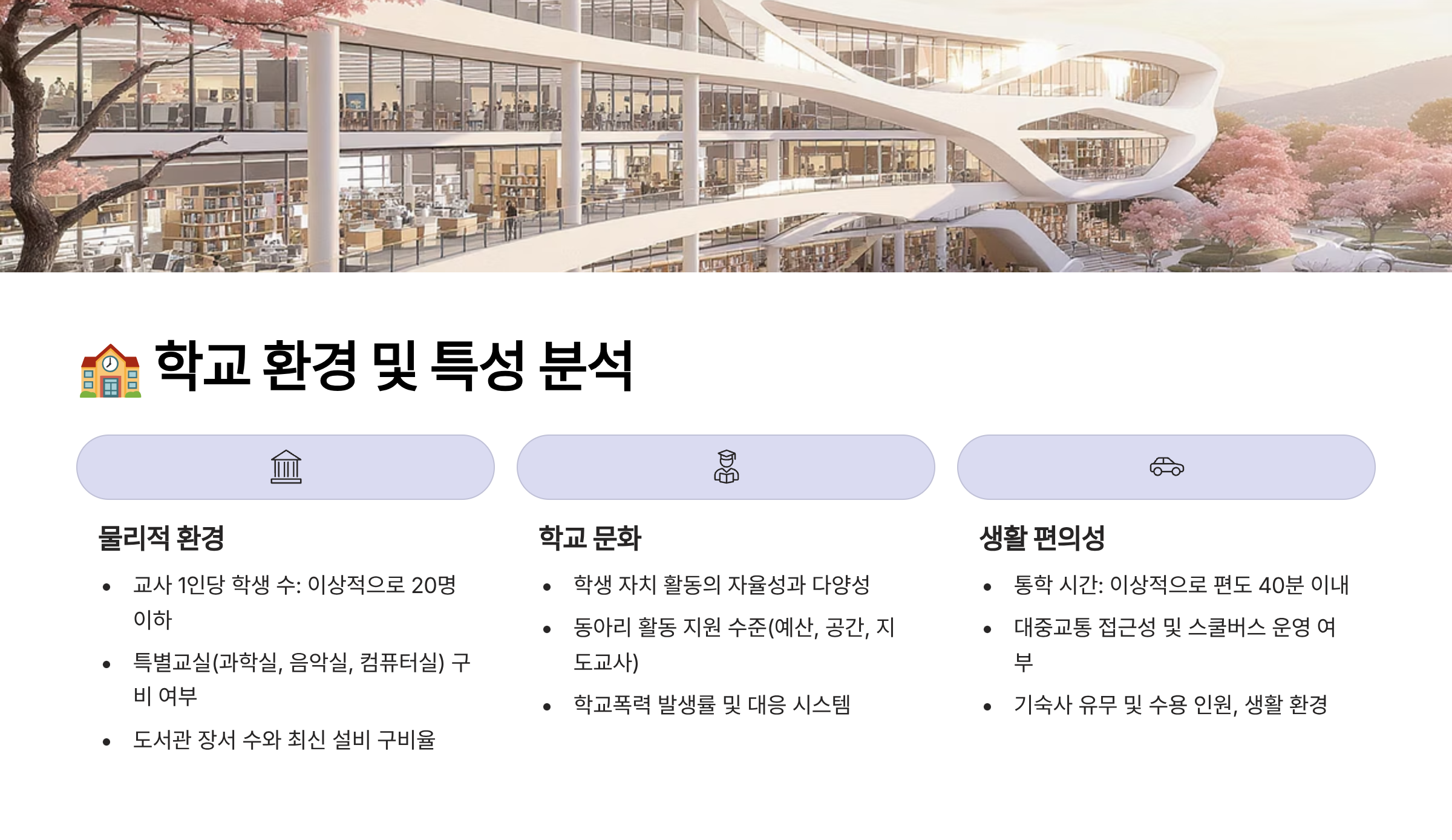 마지막으로 학교 문화와 전통도 파악해보세요. 🎓 오랜 전통을 가진 학교는 동문 네트워크가 탄탄하고, 학교에 대한 자부심이 강해요. 반면 신설 학교는 시설이 좋고 새로운 시도를 많이 하는 장점이 있어요. 어떤 환경이 자신에게 맞는지 생각해보세요!