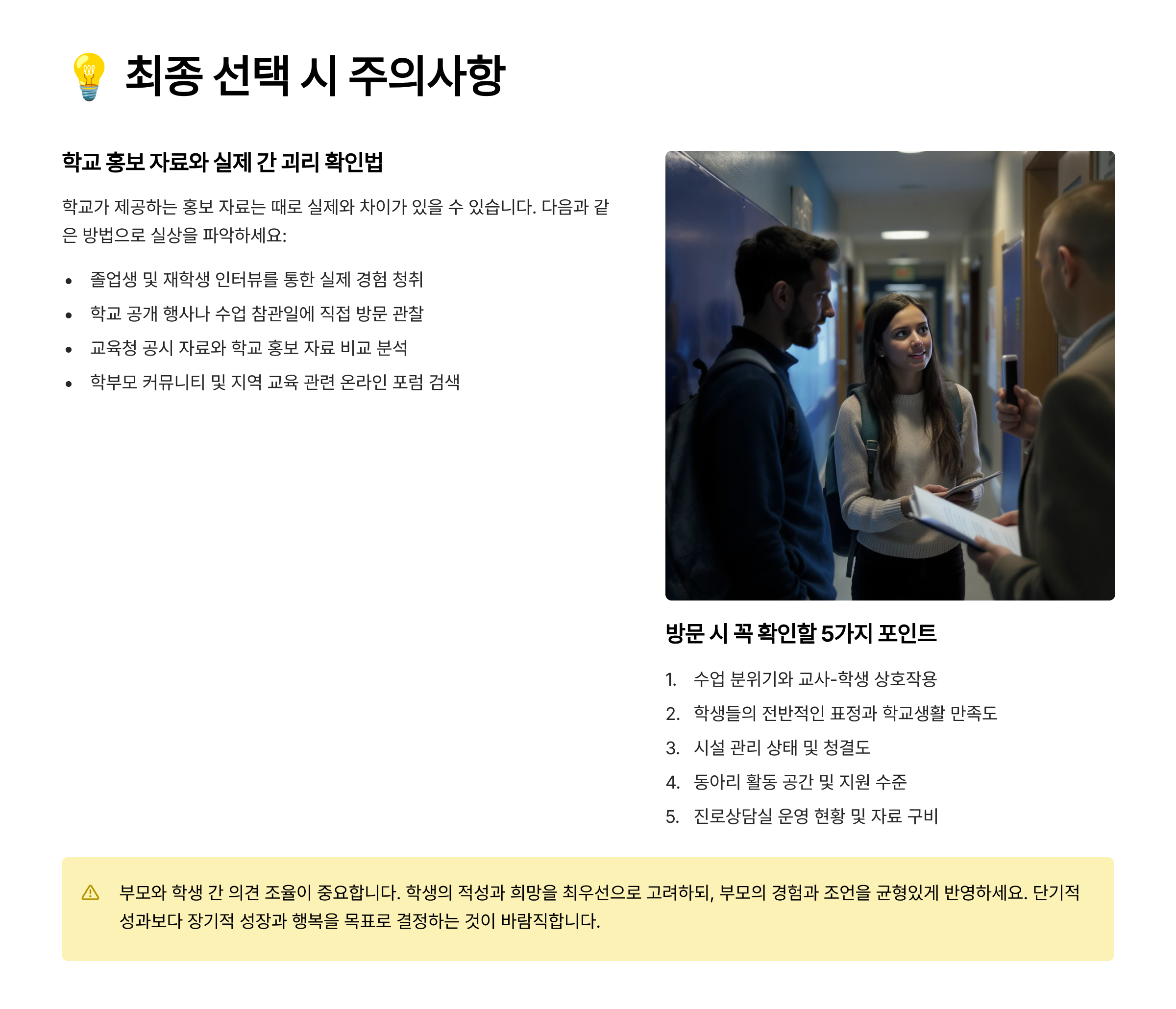 마지막으로 모든 체크리스트를 완료했다면 가족과 충분히 논의하세요. 👨‍👩‍👧‍👦 부모님의 의견도 중요하지만, 실제로 3년을 다닐 학생 본인의 의견이 가장 중요해요. 담임선생님과의 상담도 꼭 받아보고, 여러 의견을 종합해서 최종 결정을 내리세요!
