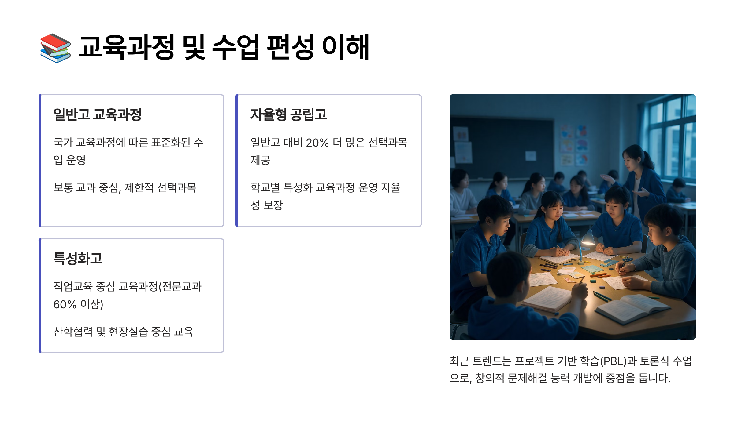예술고나 체육고는 특수 목적이 분명해요. 🎨 해당 분야에 재능과 열정이 있는 학생들을 위한 학교예요. 일반 교과 수업 시간이 적고, 전공 실기 위주로 교육과정이 편성되어 있어요. 진로가 확실하다면 최고의 선택이지만, 진로 변경이 어렵다는 단점도 있어요.