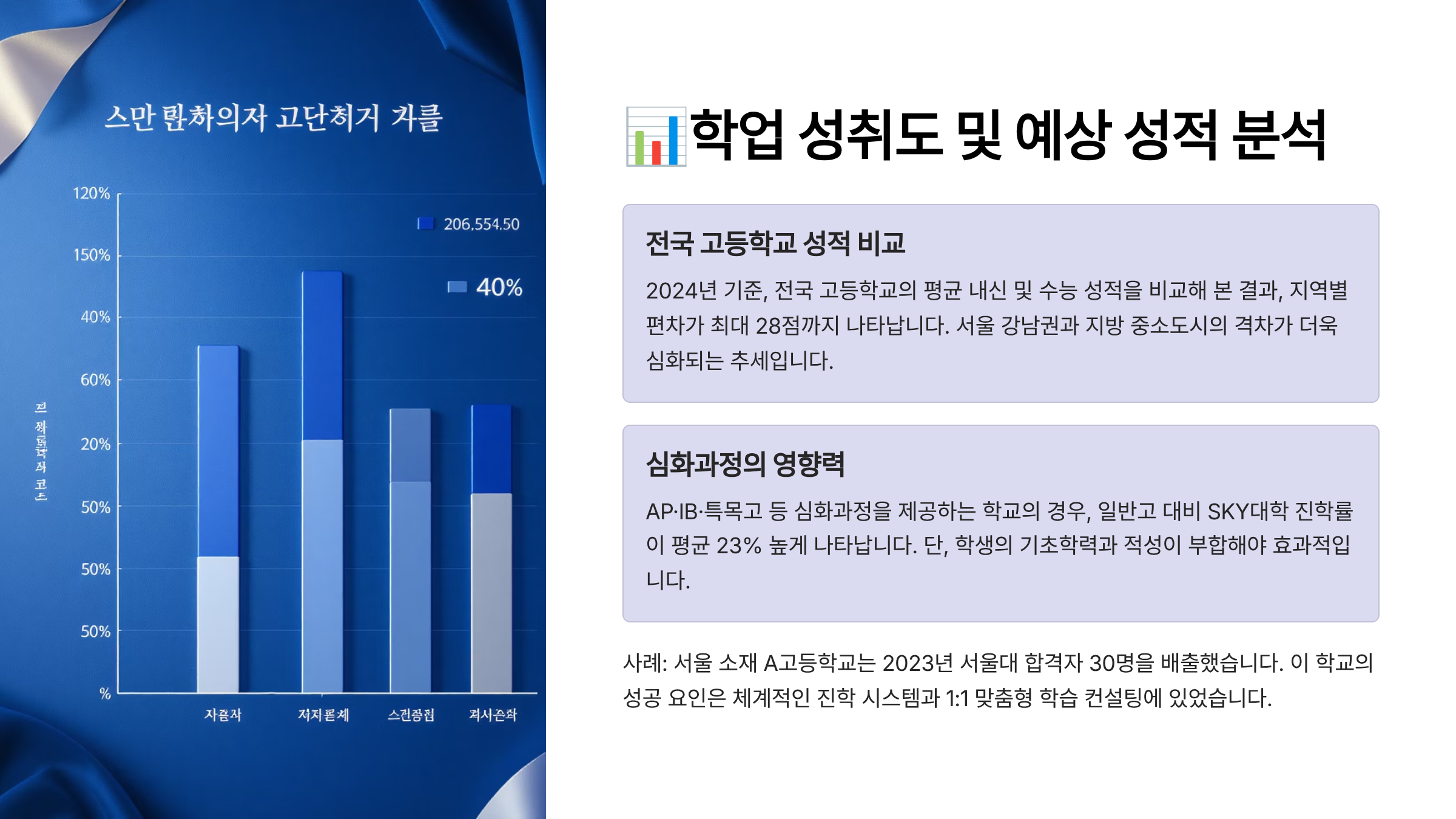 나의 생각으로는 성적만으로 학교를 선택하는 건 위험해요. 성적은 변할 수 있고, 고등학교에서의 성장 가능성도 있거든요. 하지만 현재 실력을 냉정하게 평가하고, 그에 맞는 현실적인 선택을 하는 것이 대입 성공의 첫걸음이랍니다! 📊