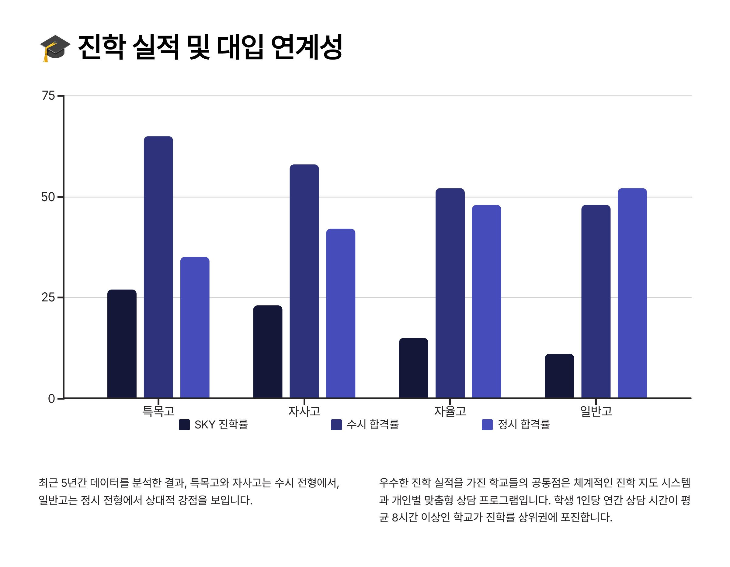 재수 비율도 중요한 지표예요. 🔄 재수 비율이 높다는 건 두 가지 의미가 있어요. 첫째, 학생들의 목표 대학 수준이 높다는 것. 둘째, 현역 합격이 어렵다는 것. 특목고나 자사고는 재수 비율이 30~40%에 달하는 경우가 많아요. 이를 감수할 준비가 되어 있는지 생각해보세요!