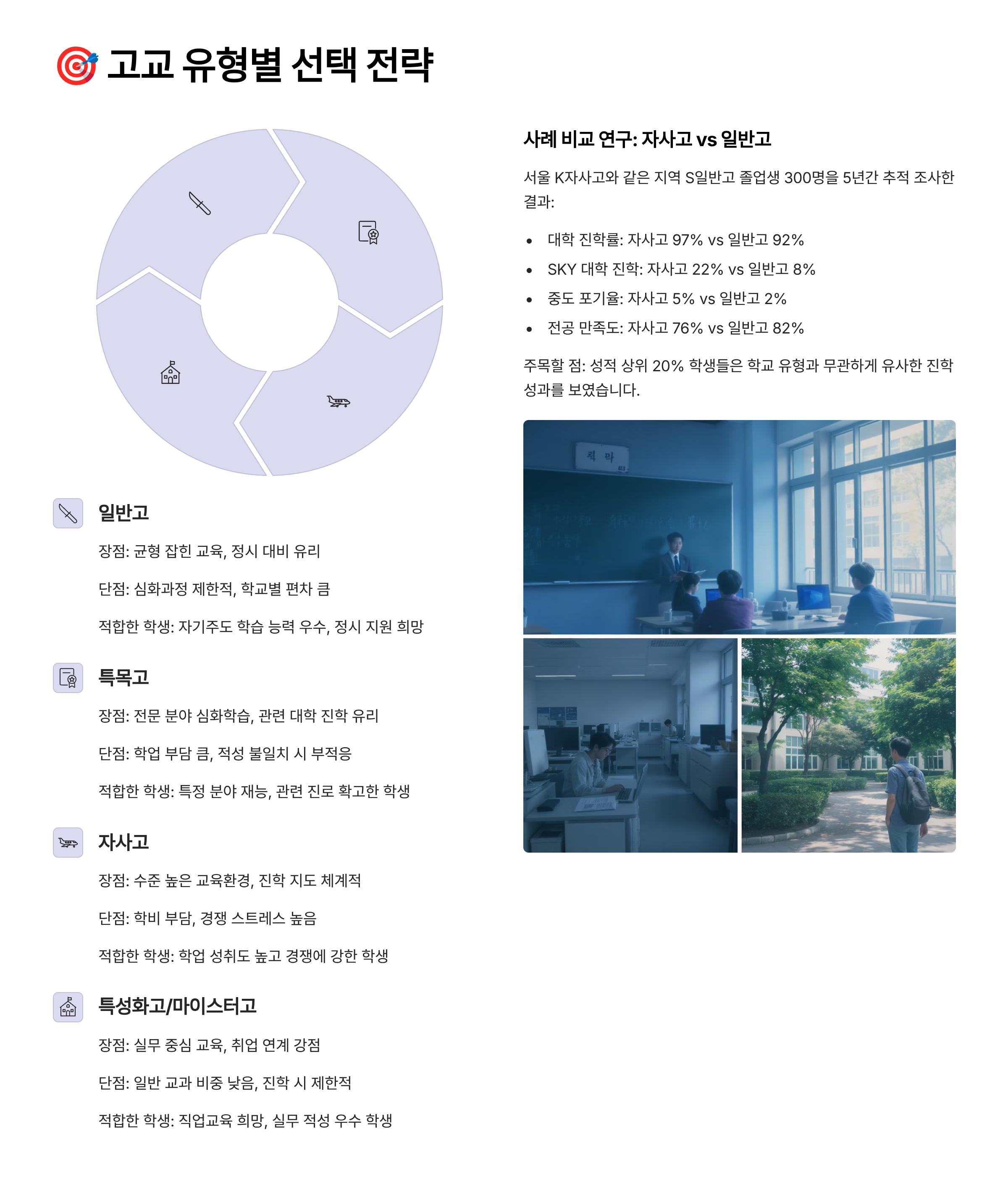 나의 생각으로는 고교 유형보다 중요한 건 '나와의 적합성'이에요. 아무리 좋은 학교라도 본인과 맞지 않으면 3년이 고통스러울 수 있어요. 자신의 성향, 학습 스타일, 진로 목표를 종합적으로 고려해서 선택하는 게 가장 중요하답니다! 🌟