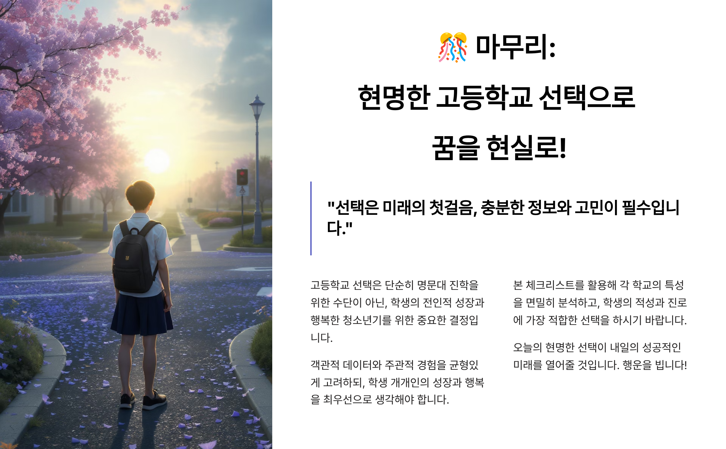 고등학교 선택은 분명 중요한 결정이지만, 인생의 전부는 아니에요. 어떤 학교를 가든 여러분의 노력과 열정이 더 중요하답니다. 최선의 선택을 하되, 그 선택을 최선으로 만들어가는 것이 진짜 실력이에요. 3년 후 멋진 모습으로 성장한 여러분을 응원합니다! 💪