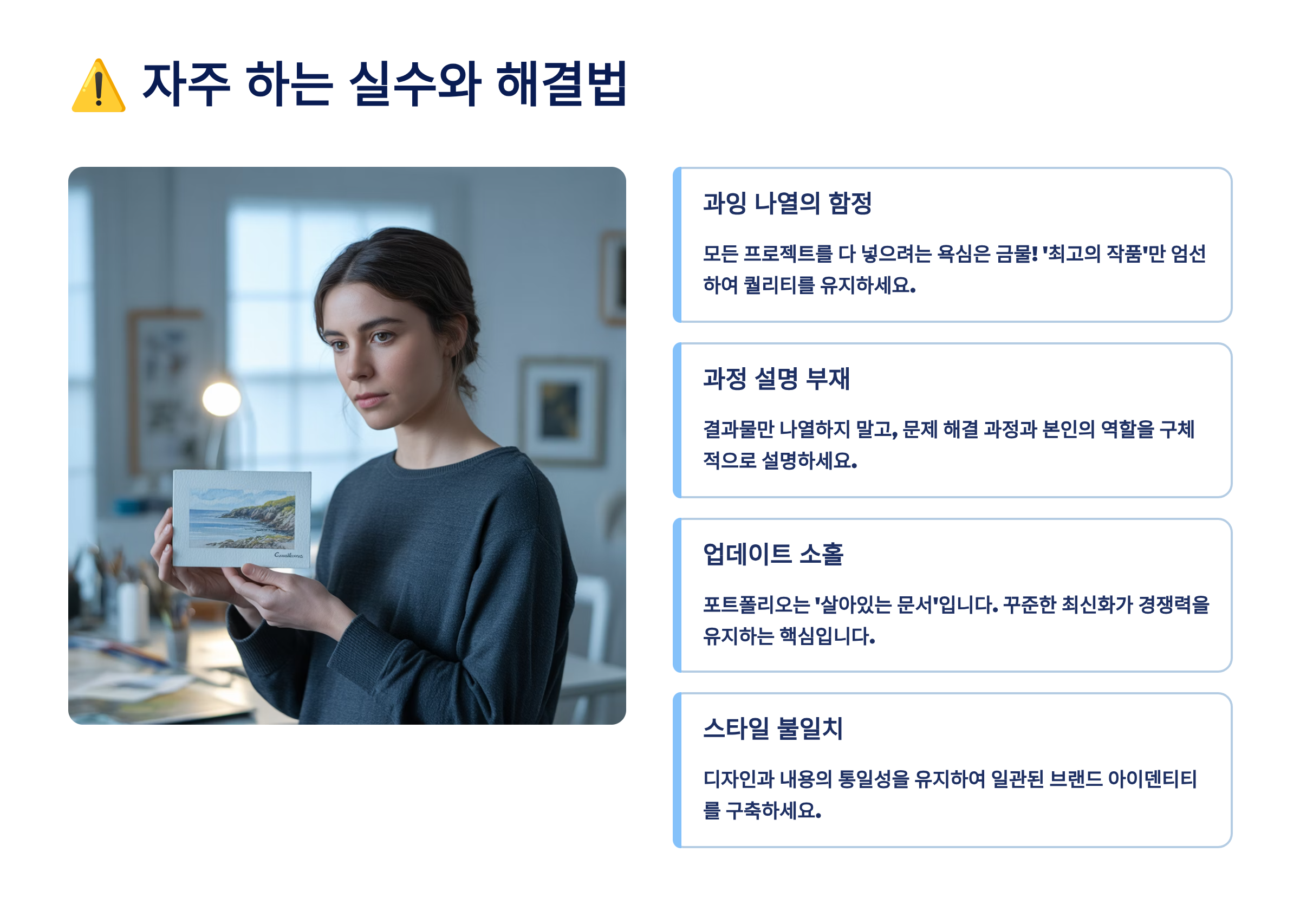 마지막으로 업데이트를 게을리하는 실수예요. 6개월 이상 지난 포트폴리오는 이미 구식이 됐을 가능성이 커요. 정기적으로 새로운 프로젝트를 추가하고, 오래된 내용은 수정하거나 제거하세요. 특히 연락처나 링크가 여전히 유효한지 주기적으로 체크하는 것을 잊지 마세요. 살아있는 포트폴리오가 좋은 인상을 남겨요! ⚠️