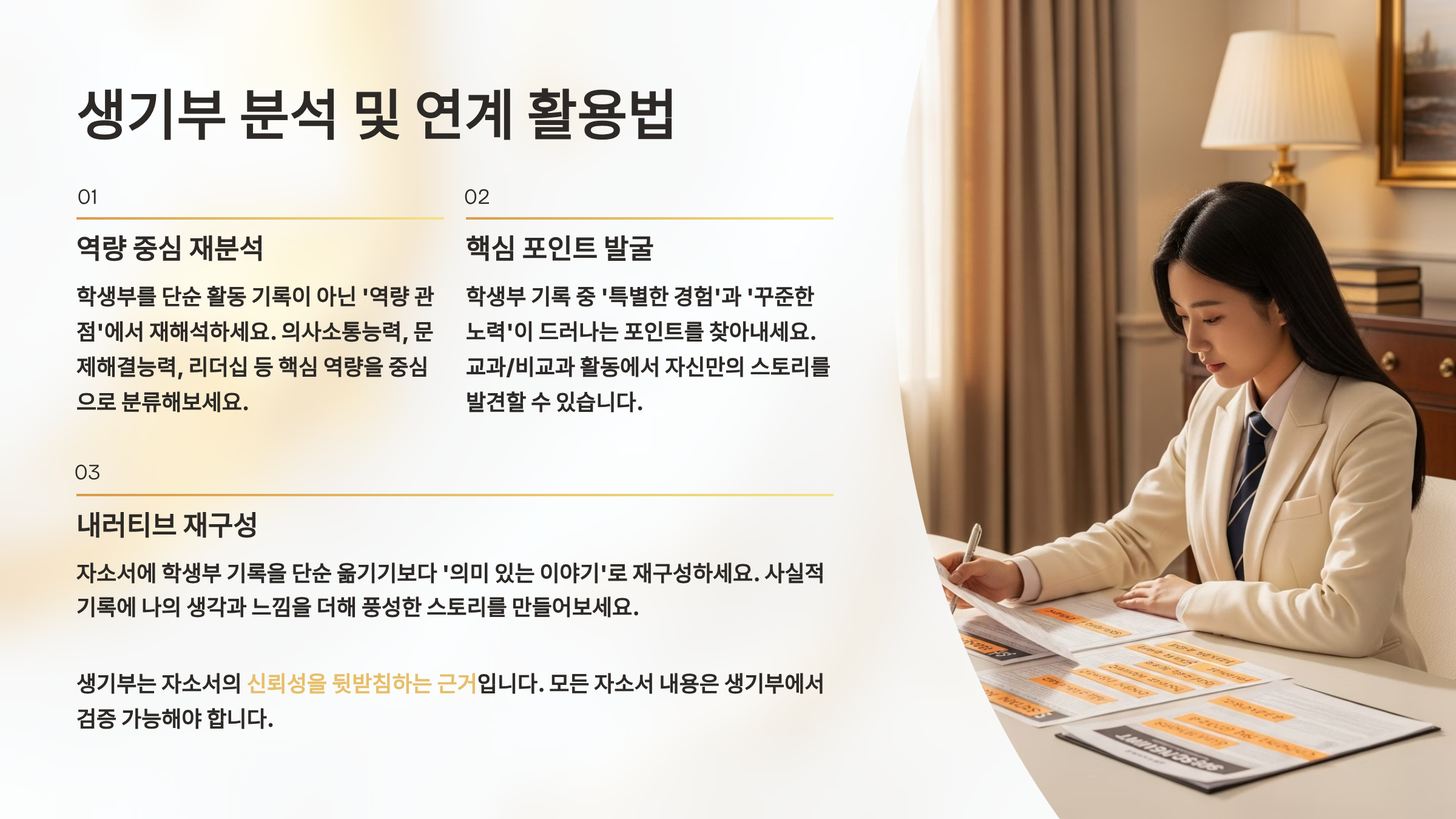 자소서 작성의 첫걸음은 생기부를 완벽하게 분석하는 거예요. 생기부는 여러분의 3년간 학교생활이 압축된 보물창고와 같아요. 하지만 많은 학생들이 생기부를 대충 훑어보고 자소서를 쓰기 시작하는 실수를 해요. 생기부의 모든 항목을 꼼꼼히 읽고, 자소서에 활용할 수 있는 소재들을 체계적으로 정리해야 해요! 📚