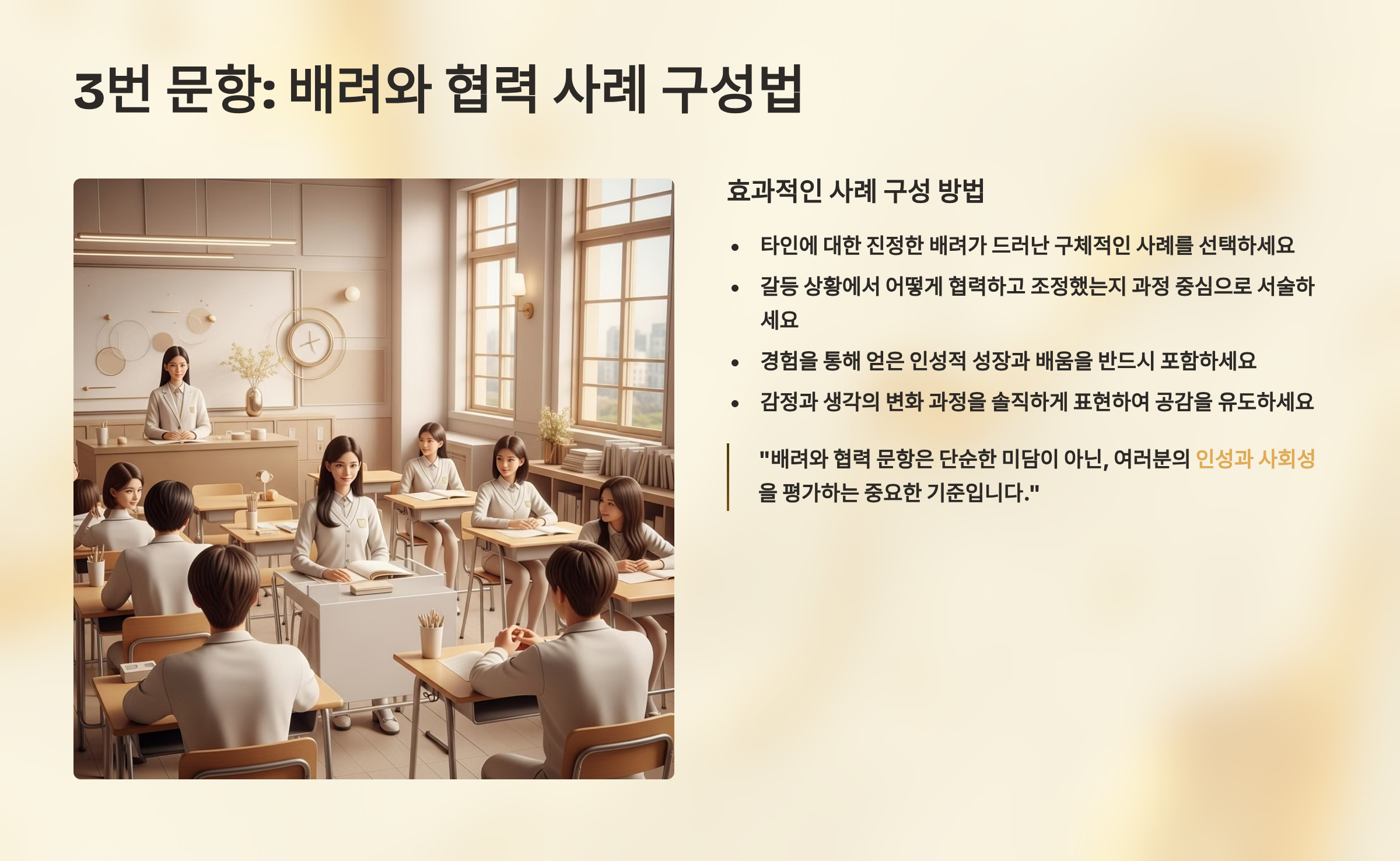 3번 문항은 "학교생활 중 배려, 나눔, 협력, 갈등 관리 등을 실천한 사례를 들고, 그 과정을 통해 느낀 점을 기술하라"는 내용이에요. 이 문항은 2번과 비슷해 보이지만, 더 구체적인 '사례' 중심으로 작성해야 해요. 거창한 미담보다는 일상 속 작은 실천이 더 진정성 있게 다가온답니다! 🤗
