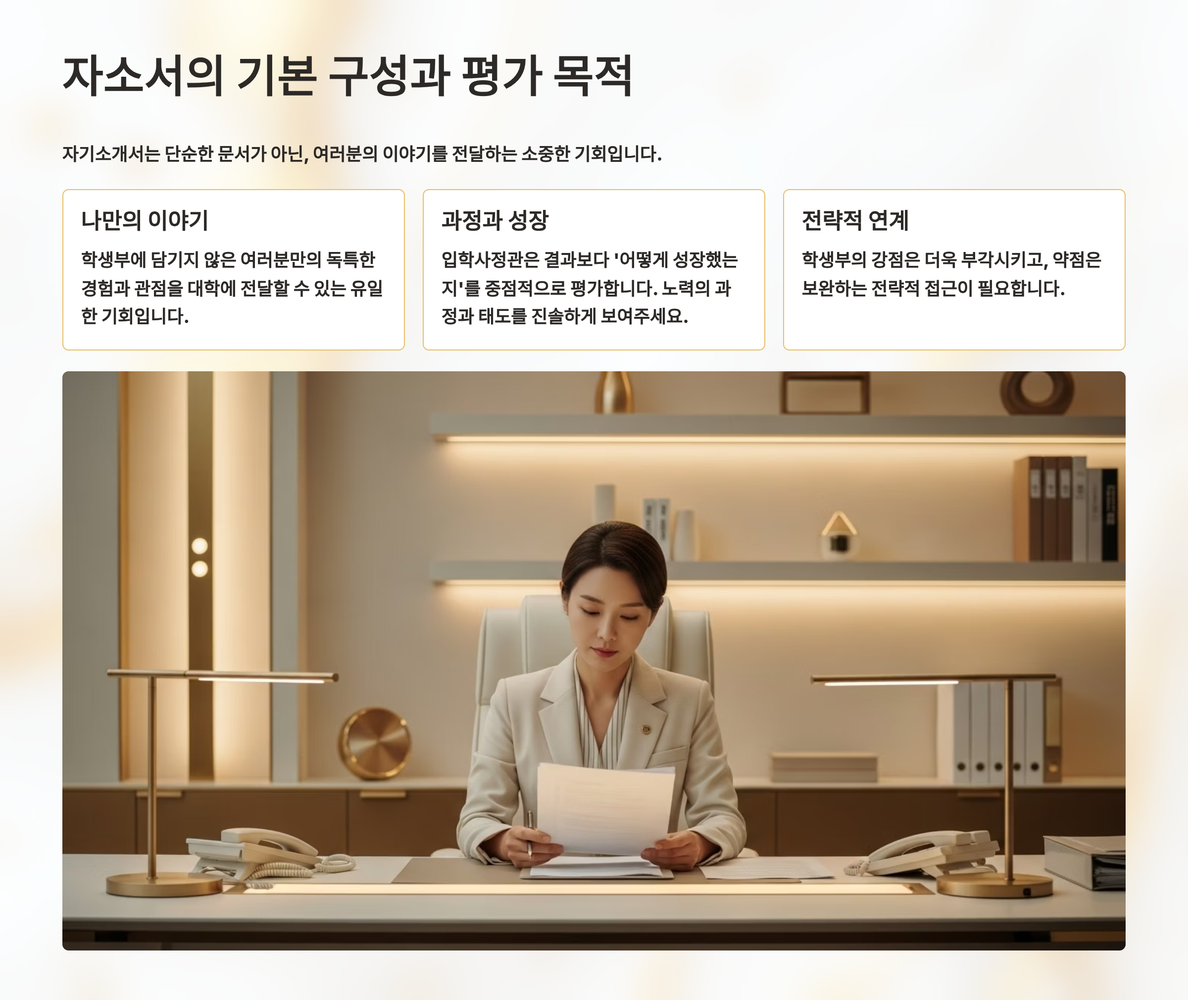 자소서는 여러분의 성장 스토리를 담는 그릇이에요. 완벽한 모습을 보여주려 하지 말고, 부족했던 모습에서 시작해 노력을 통해 성장한 과정을 솔직하게 담아내세요. 평가자들은 완성된 인재보다 계속 성장할 가능성이 있는 학생을 더 높이 평가한답니다! 🌱