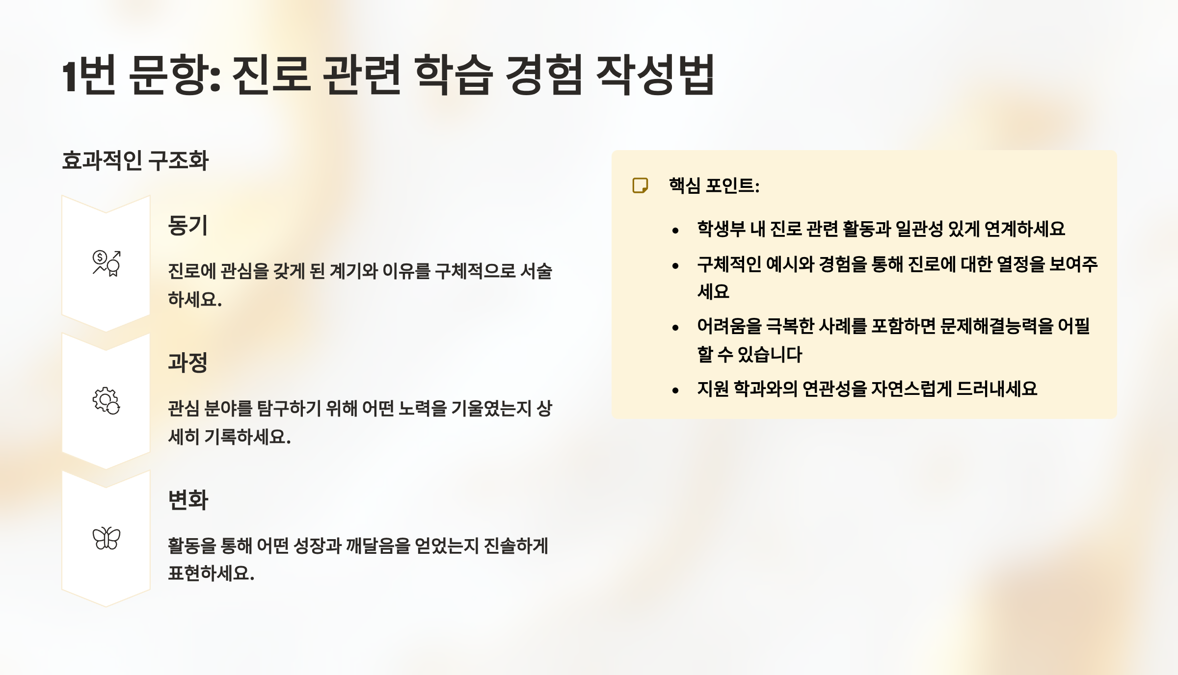 효과적인 1번 문항 작성을 위해서는 먼저 자신의 진로 목표를 명확히 해야 해요. 막연하게 "의사가 되고 싶다"가 아니라 "감염병 전문의가 되어 신종 바이러스 연구를 하고 싶다"처럼 구체적인 목표를 제시하세요. 그리고 이 목표를 위해 고교 3년간 어떤 노력을 기울였는지 시간 순서대로 정리해보세요.