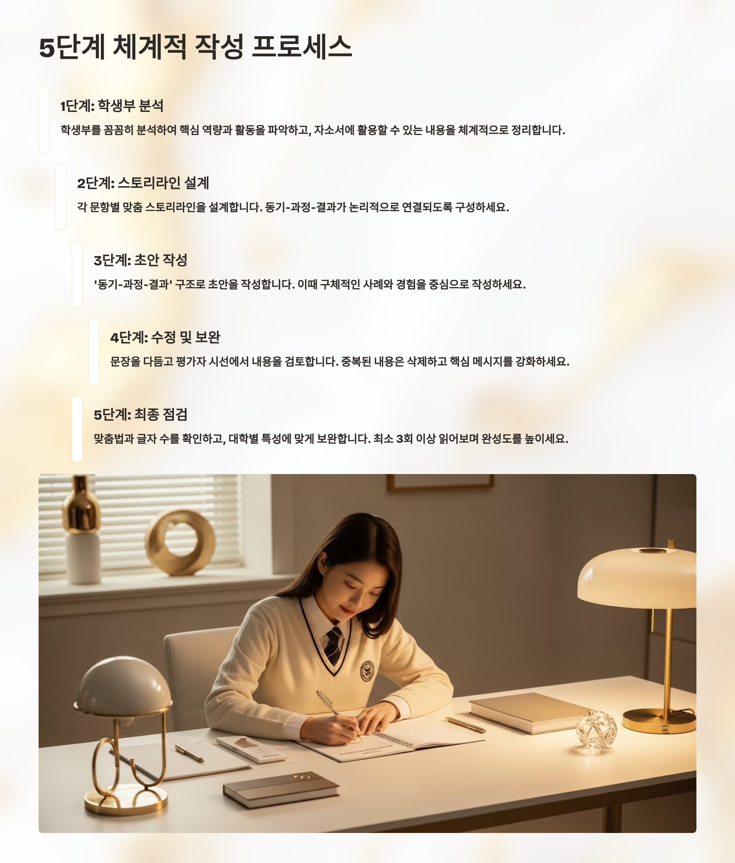 자소서를 체계적으로 작성하기 위해서는 단계별 접근이 필요해요. 많은 학생들이 바로 글쓰기부터 시작하는데, 이는 비효율적이고 완성도도 떨어져요. 전문가들이 추천하는 5단계 프로세스를 따라가면 누구나 체계적이고 완성도 높은 자소서를 작성할 수 있어요. 각 단계마다 충분한 시간을 투자하고, 급하게 진행하지 마세요! ⏰