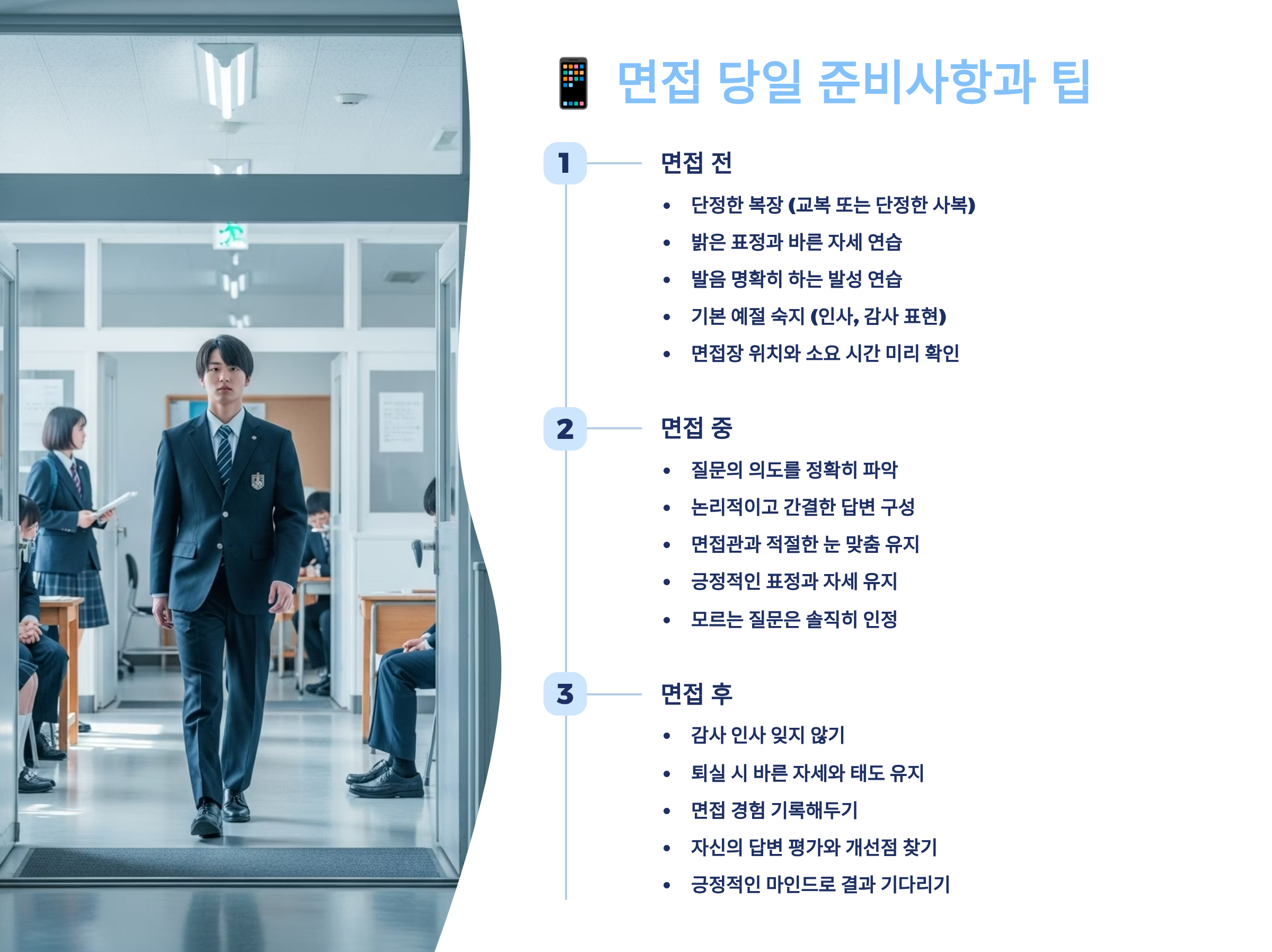 면접 전날 체크리스트를 만드세요. 준비물(신분증, 수험표), 복장(교복 다림질), 이동 경로, 도착 시간 등을 미리 확인하세요. 예상 질문과 답변 키워드를 한 번 더 점검하되, 너무 늦게까지 공부하지 마세요. 충분한 수면이 최상의 컨디션을 만들어요! 😴