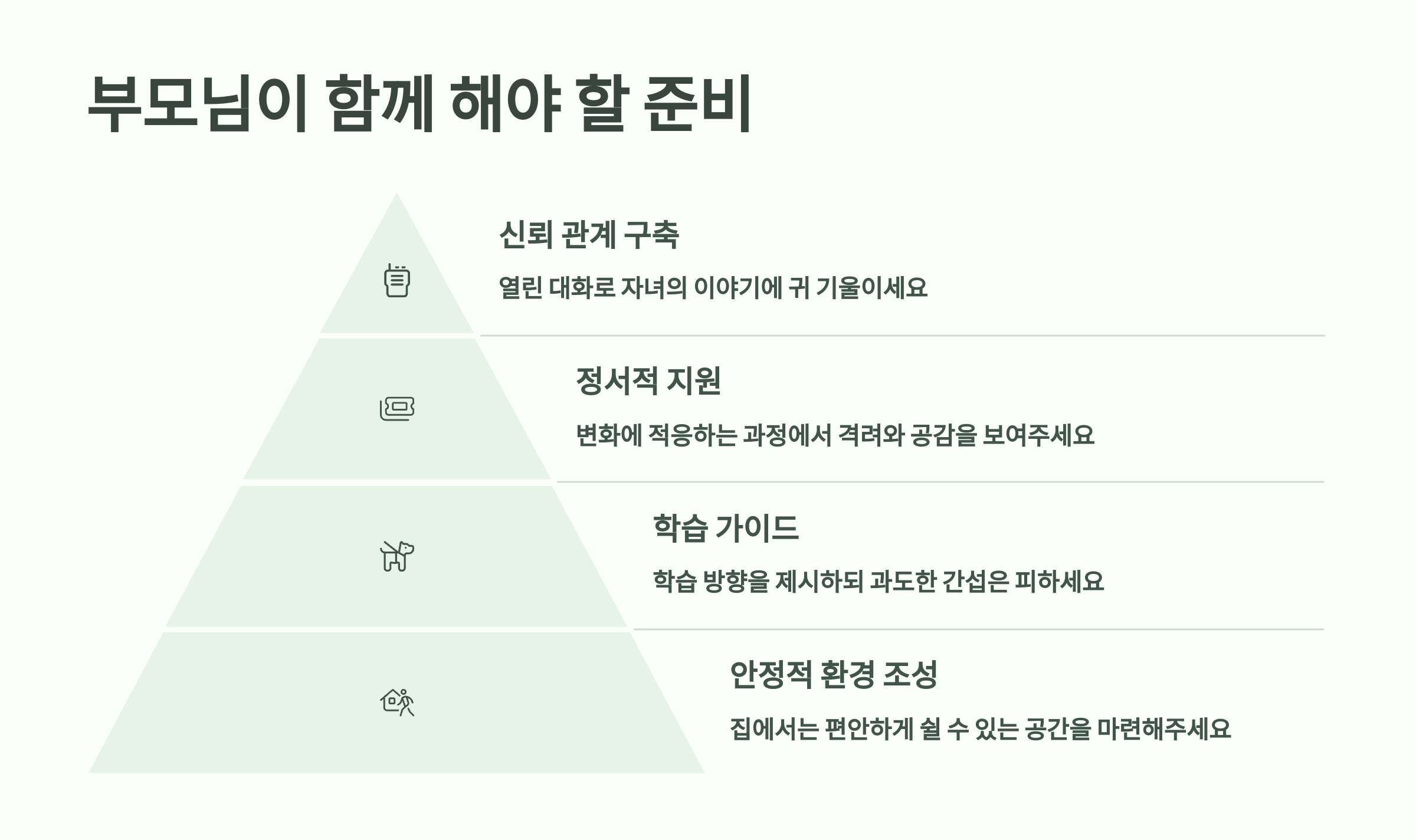 💬 초등학교 때는 부모가 대부분을 주도했지만, 중학교는 아이 스스로 계획하고 움직여야 해요. 이제는 ‘지도자’보다는 ‘조력자’로서의 태도가 필요하죠.