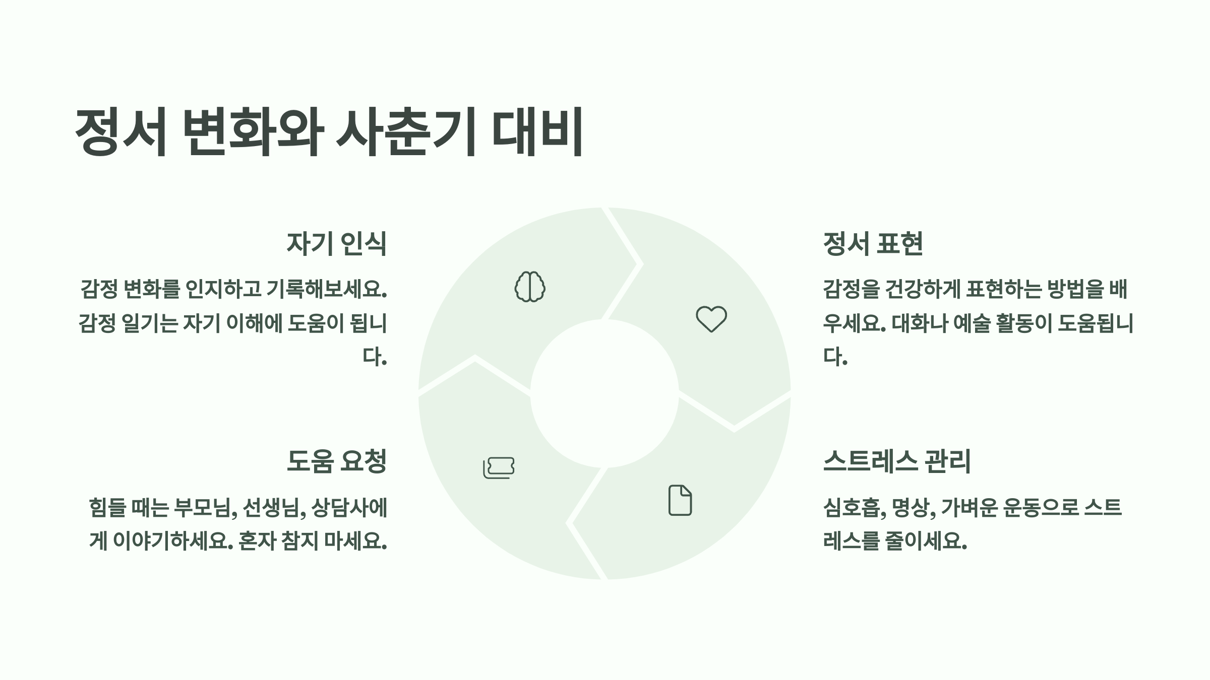 🧠 중학생이 되는 시기는 신체뿐 아니라 정서와 감정의 폭발적인 변화가 함께 찾아와요. '사춘기'라는 단어가 괜히 나온 게 아니죠! 아이도 낯설고, 부모도 당황스러운 시기예요.