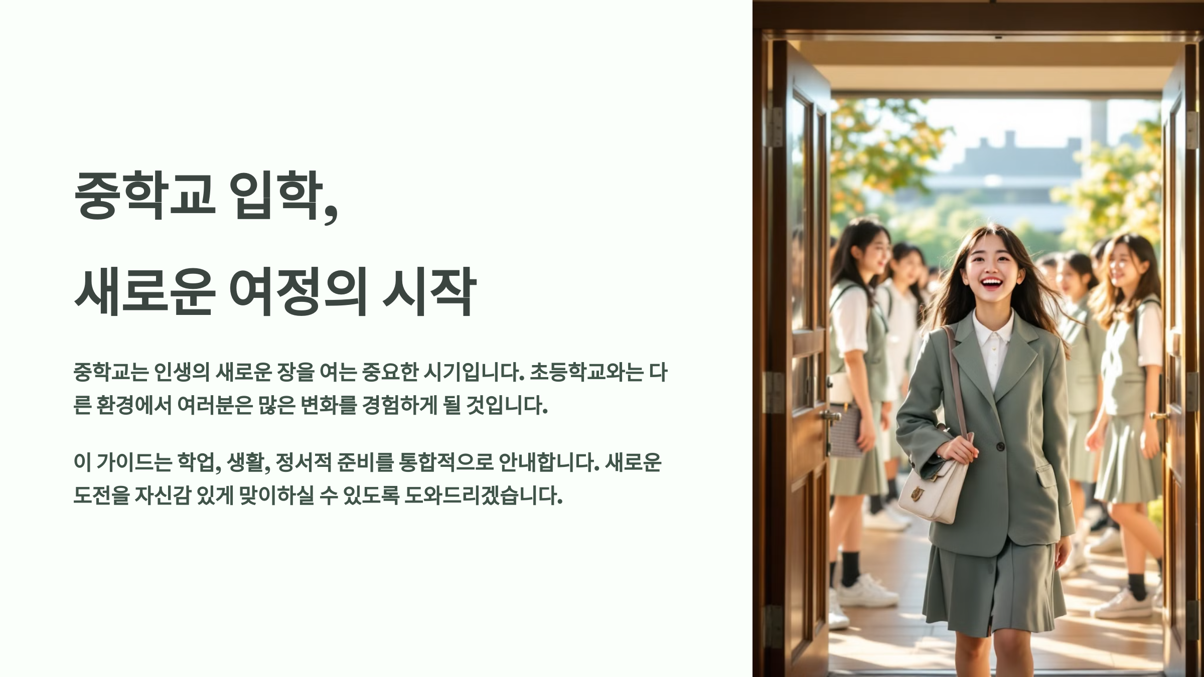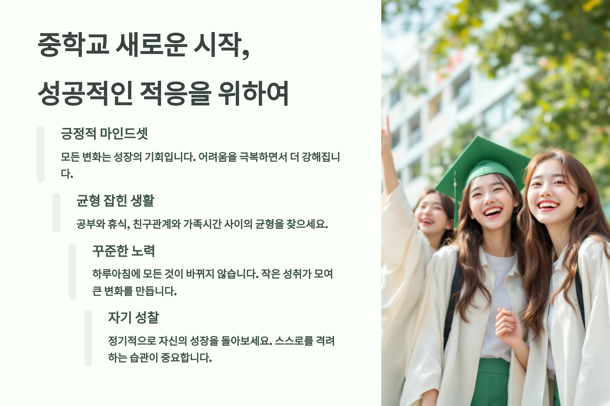📘 이 글에서는 공부 준비는 물론이고, 생활습관, 친구 관계, 정서적 변화, 부모의 역할까지 중학교 입학을 앞둔 모든 학생과 보호자를 위한 꿀팁을 정리했어요. 우리 아이의 멋진 중학교 생활을 위한 완벽 가이드! 지금부터 함께 시작해요 😊