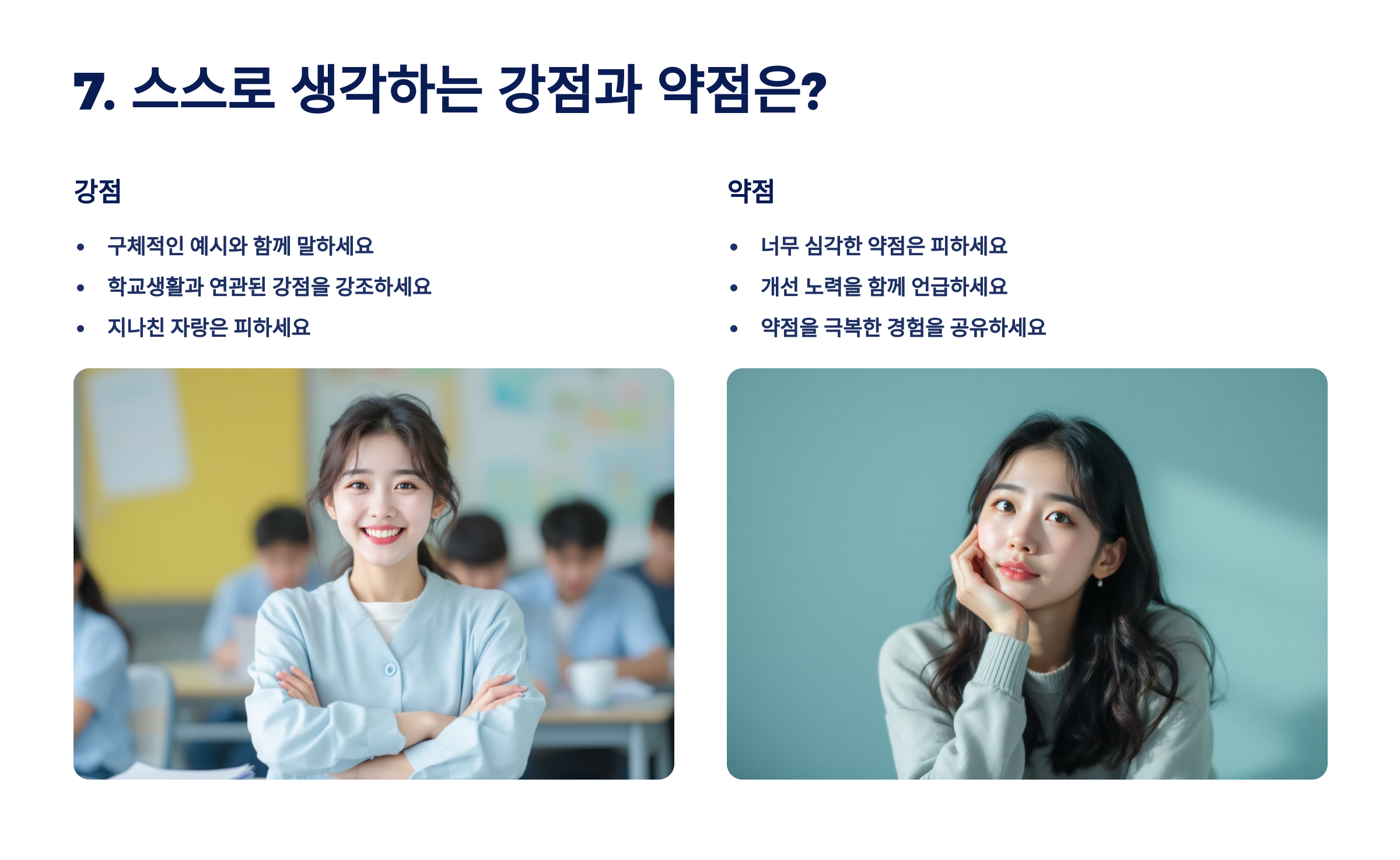 “저의 강점은 책임감이에요. 학급 임원을 맡았을 때 친구들의 의견을 정리해서 선생님께 전달하는 역할을 맡았는데, 한 번도 빠지지 않고 정리해서 공유했어요. 덕분에 친구들과도 더 가까워졌어요. 반면 약점은 발표할 때 긴장을 많이 한다는 거예요. 그래서 발표 전에 미리 연습하고, 친구 앞에서 말해보는 습관을 들이려고 노력하고 있어요.”