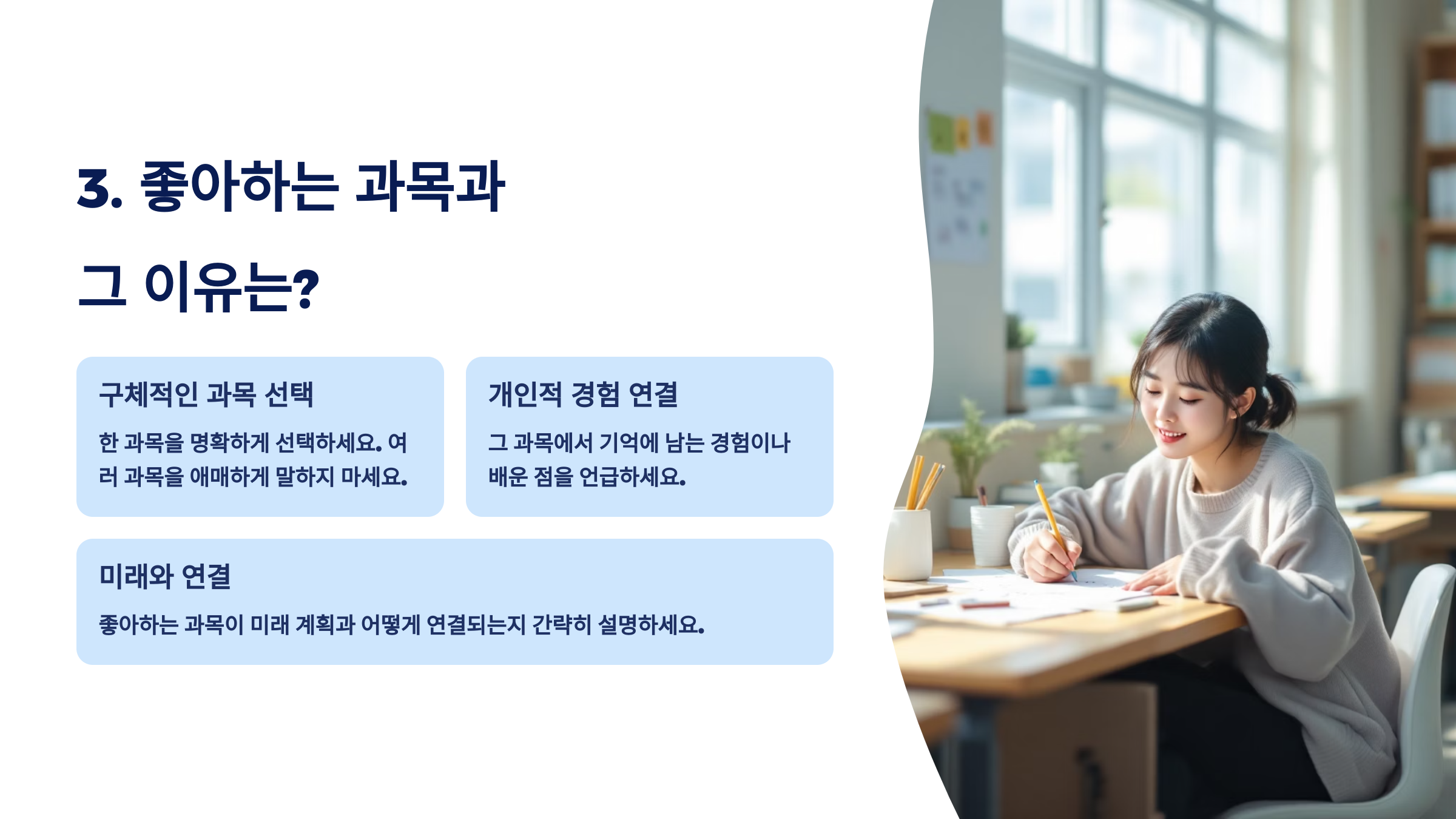 📖 단순히 “국어요”라고만 말하면 아쉬운 답변이 돼요. 왜 그 과목이 재미있는지, 어떤 활동에서 흥미를 느꼈는지를 구체적으로 말하면 면접관에게 기억에 남을 수 있어요. 가능하다면 진로와 연결하면 더 좋아요.