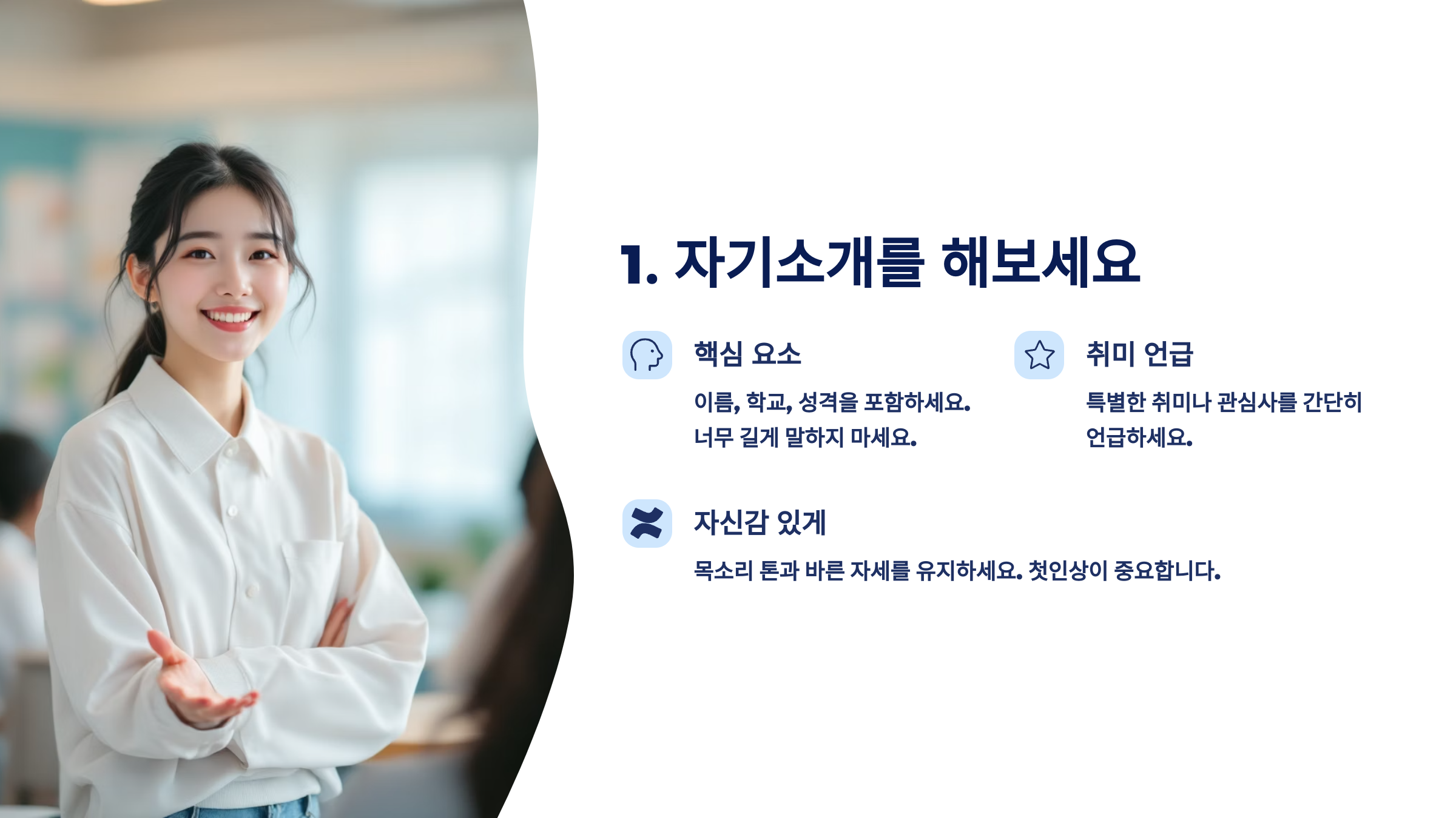 ✅ 포인트: 웃으며 또박또박 말하기, 자기만의 경험 1개 넣기