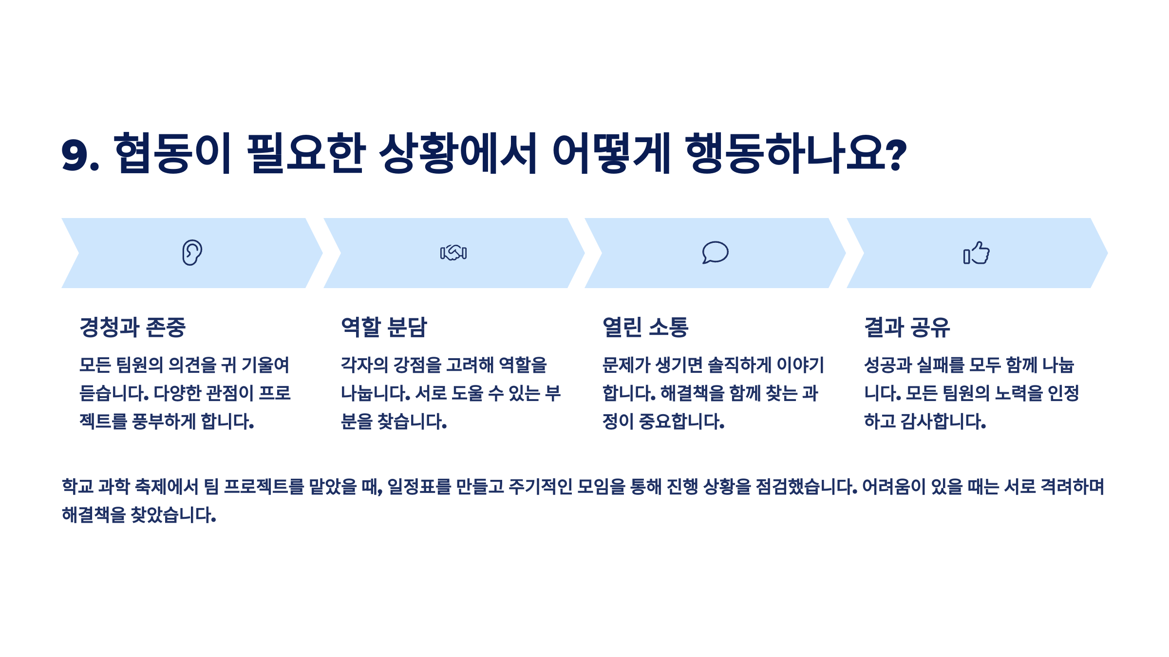 “모둠 활동에서 역할을 정할 때 의견이 갈린 적이 있었어요. 저는 모두의 생각을 한 번씩 들어보자고 제안했고, 결국 각자 잘할 수 있는 일을 맡기로 했어요. 저는 발표를 맡았고, 친구는 자료 정리를 했어요. 결과적으로 발표도 잘 마무리됐고, 팀원 모두가 만족했어요. 협동할 땐 먼저 상대 이야기를 듣고 조율하는 게 중요하다고 생각해요.”