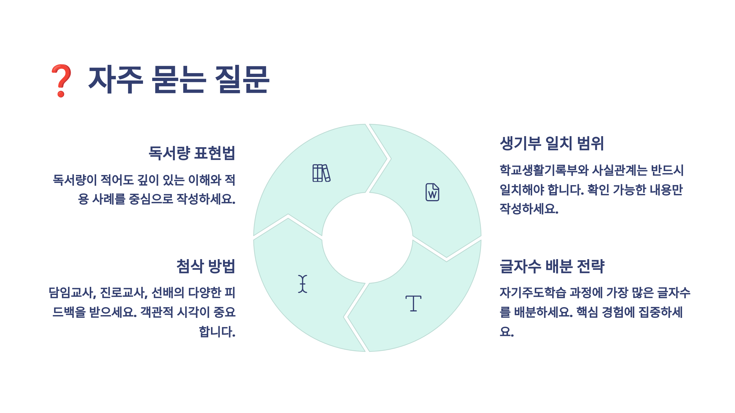 활동의 크기보다 어떤 태도로 임했는지, 무엇을 배우고 변화했는지가 더 중요해요. 글 속에서 나라는 사람이 드러나야 면접에서도 일관성 있게 어필할 수 있답니다! 😉📘