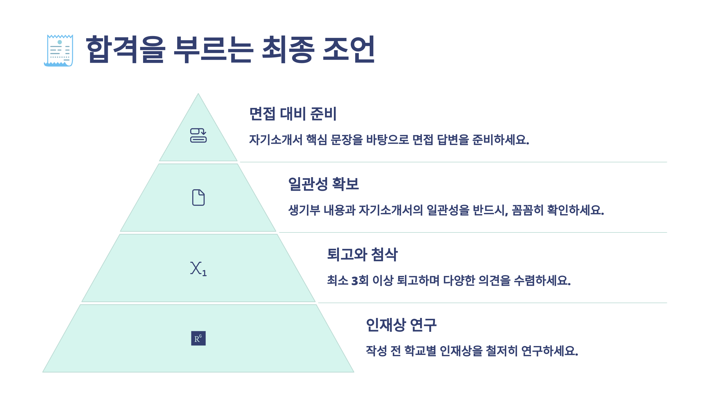 즉, 자사고 자기소개서는 단순히 ‘좋은 이미지’가 아니라 구체적인 경험을 기반으로 한 태도와 사고방식을 보여주는 도구예요. 교과성적만으로는 알 수 없는 내면을 어필할 수 있는 절호의 기회인 만큼, 전략적으로 접근해야 해요! 🧾🔥