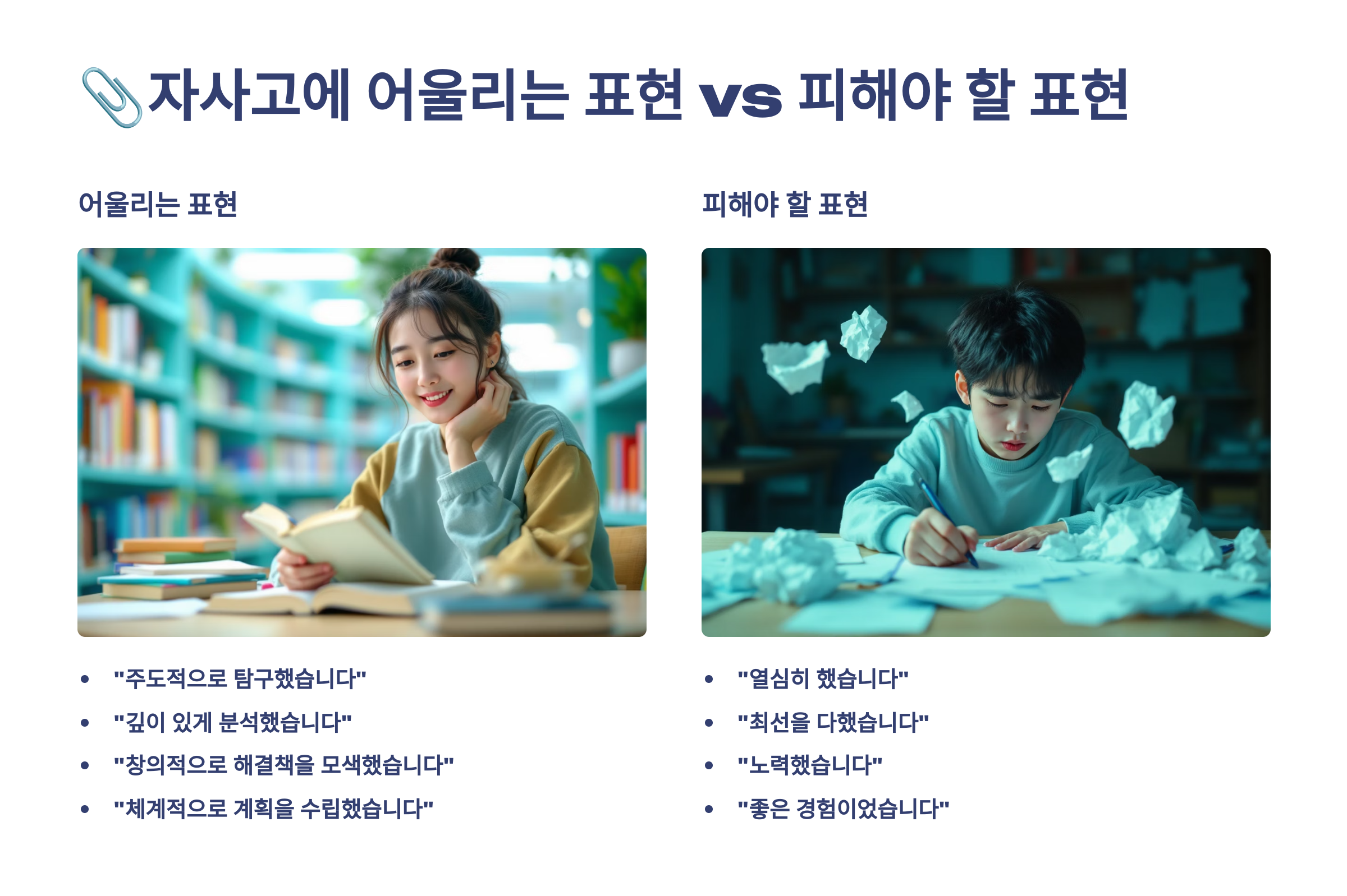 자사고는 학문적 태도, 문제 해결력, 협업 능력을 중요하게 보기 때문에, 표현도 구체적이고 분석적인 문장으로 써야 해요. 즉, ‘열정’보다 ‘지속적인 탐구’, ‘최선’보다 ‘실행 계획’ 같은 단어가 더 어울려요. 🎯🧠