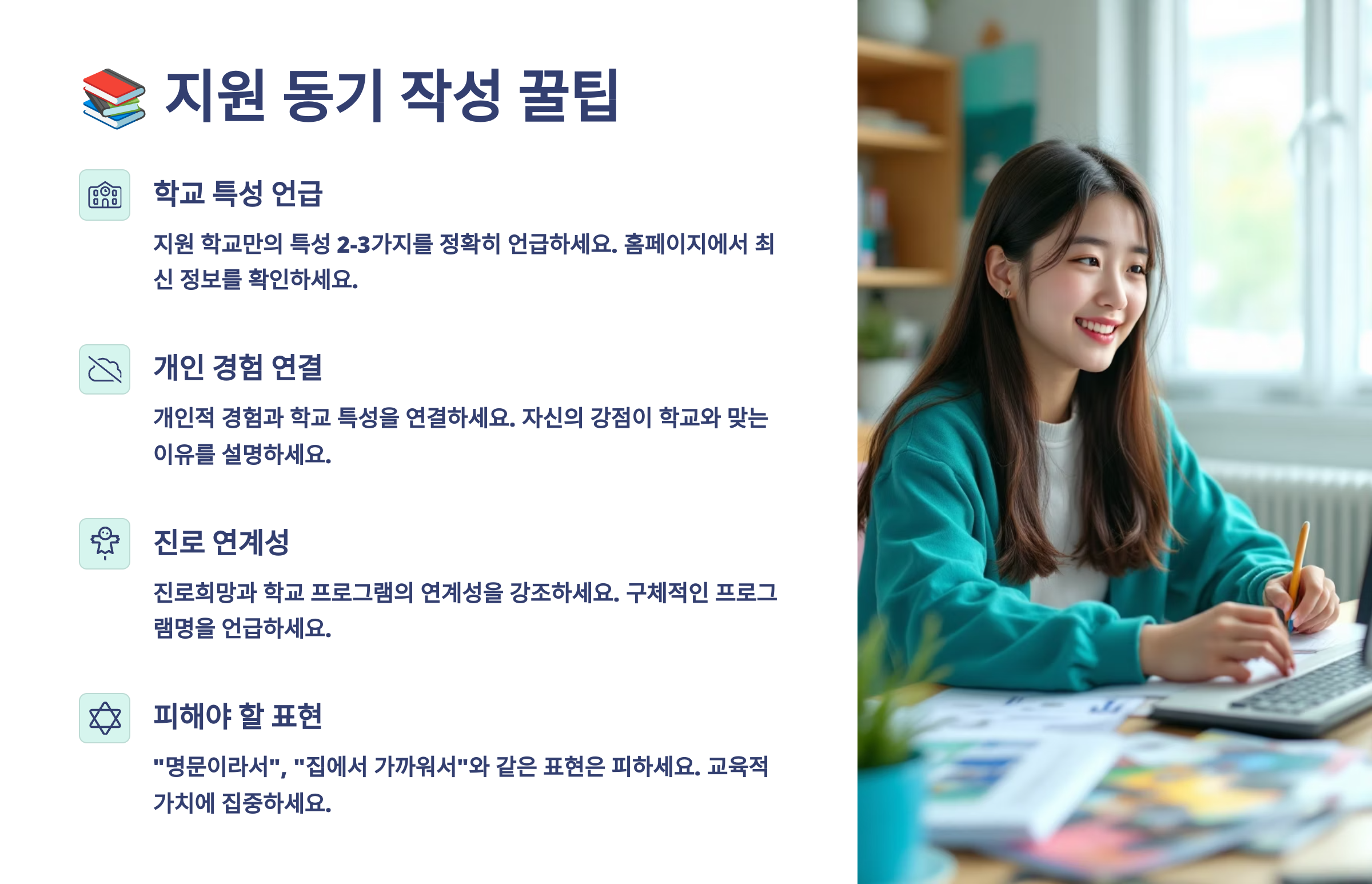 좋은 지원 동기는 반드시 본인의 경험이나 진로 목표와 학교의 교육 방향이 연결돼야 해요. “이 학교에서 공부하고 싶다”는 마음만 말하지 말고, 왜 ‘이 학교여야만 하는지’에 대한 근거가 들어가야 해요. 🔍📌