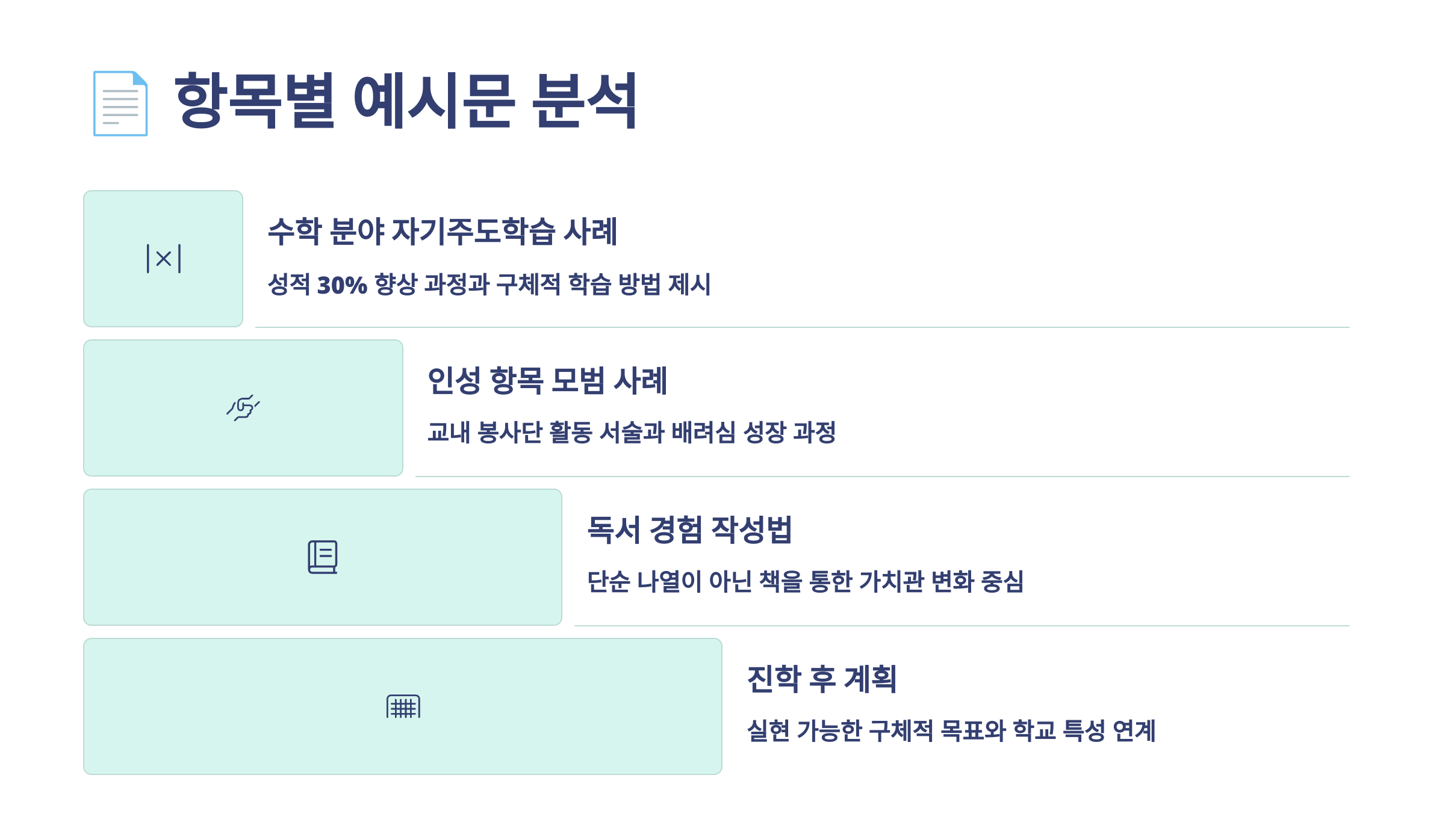 예를 들어, 일반적인 표현인 “책임감 있는 학생입니다”보다는, “중학교 2학년 때부터 학급 자율학습 관리를 맡아 월간 계획표를 만들고 친구들과 함께 학습 분위기를 조성했습니다”처럼 실제 활동을 근거로 한 표현이 훨씬 신뢰를 줄 수 있어요. 🎯📊