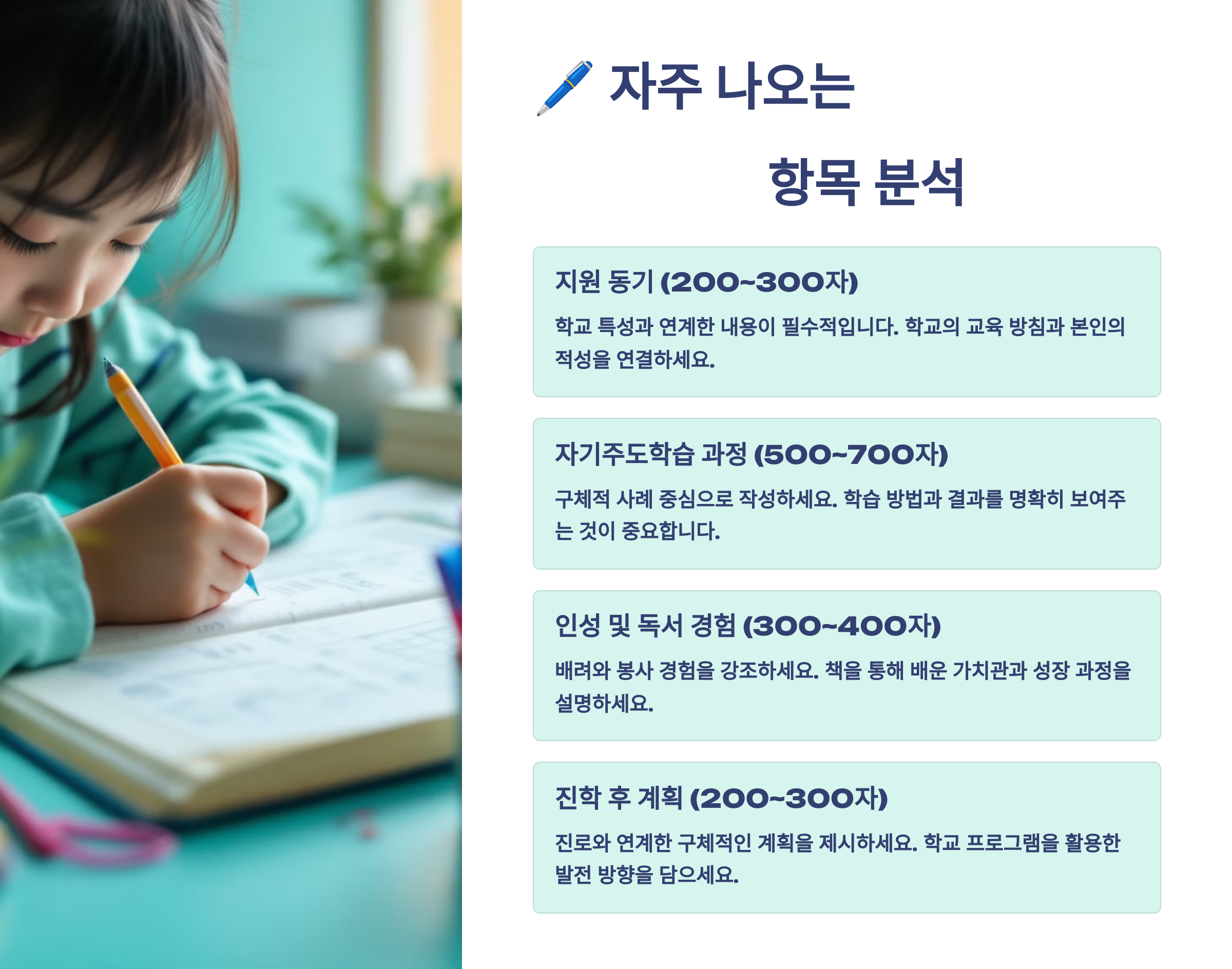 자사고 자기소개서는 학교마다 양식이 조금씩 다르지만, 대체로 공통적으로 묻는 항목이 정해져 있어요. 이 항목들을 미리 분석하고 대비하면 여러 자사고에 응시하더라도 글의 방향이 흔들리지 않고 일관성 있게 유지할 수 있어요. 📑🎯