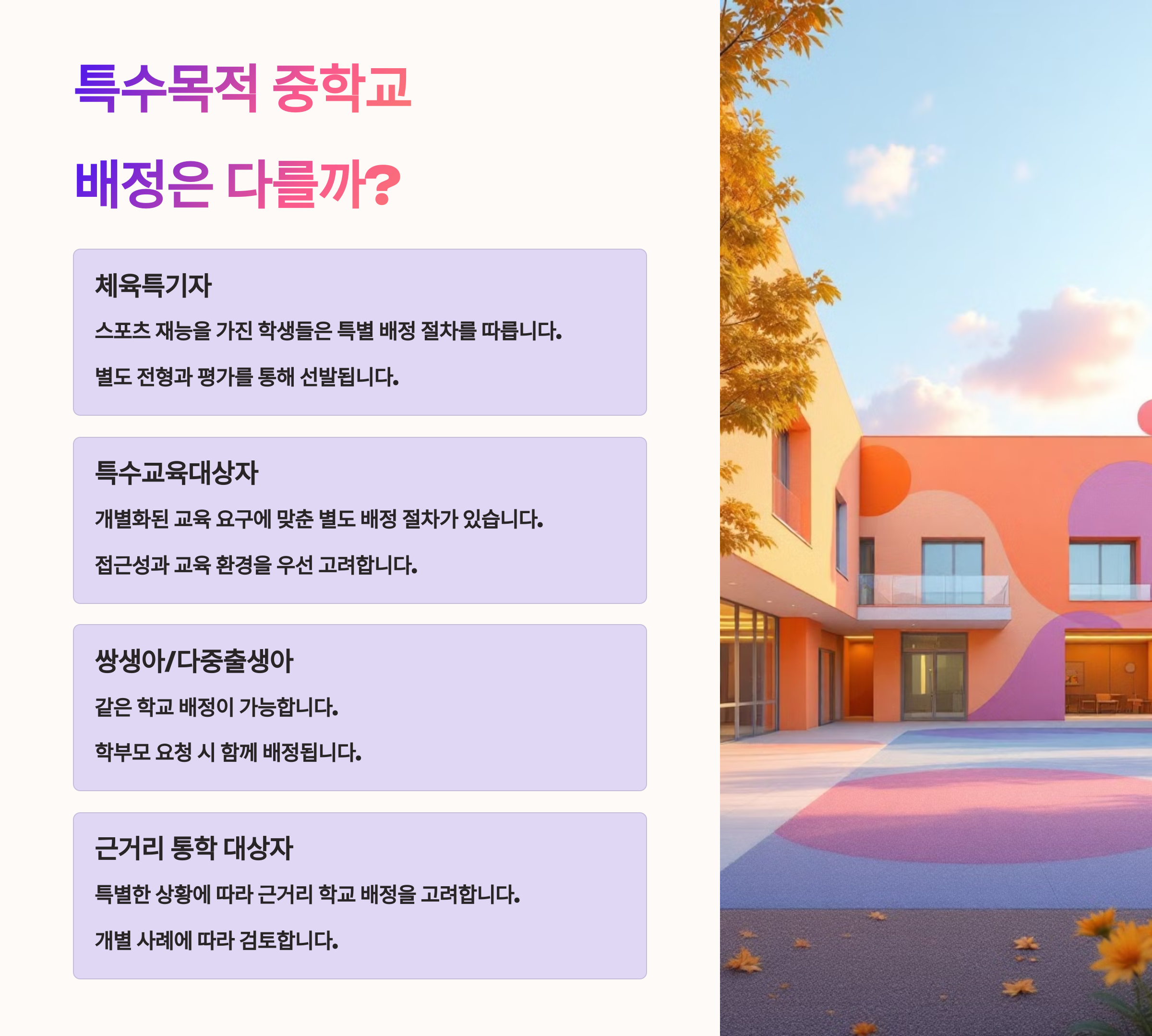 🎨 일반 배정과 달리, 특수목적 중학교는 별도의 지원과 선발 절차가 있어요. 예술중, 체육중, 과학중, 국제중, 외국어중 등은 입학시험 또는 서류심사를 통해 학생을 선발해요.