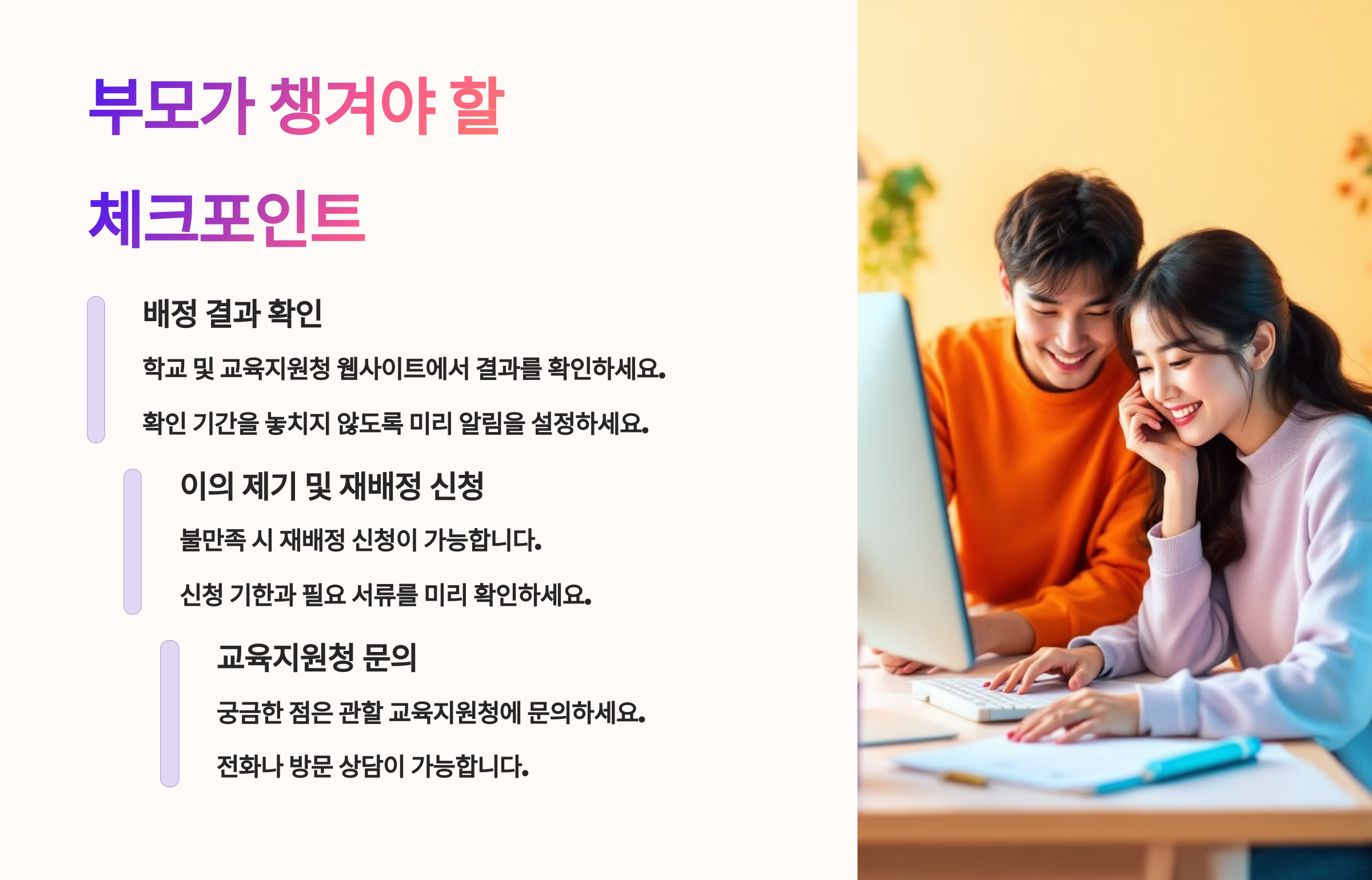 📢 배정은 공정하고 자동화된 시스템으로 이뤄지지만, 사람이 입력하는 과정에서 실수가 있을 수도 있어요. 내 아이의 배정 결과가 이상하다면, 꼭 이의신청 절차를 활용해보세요!