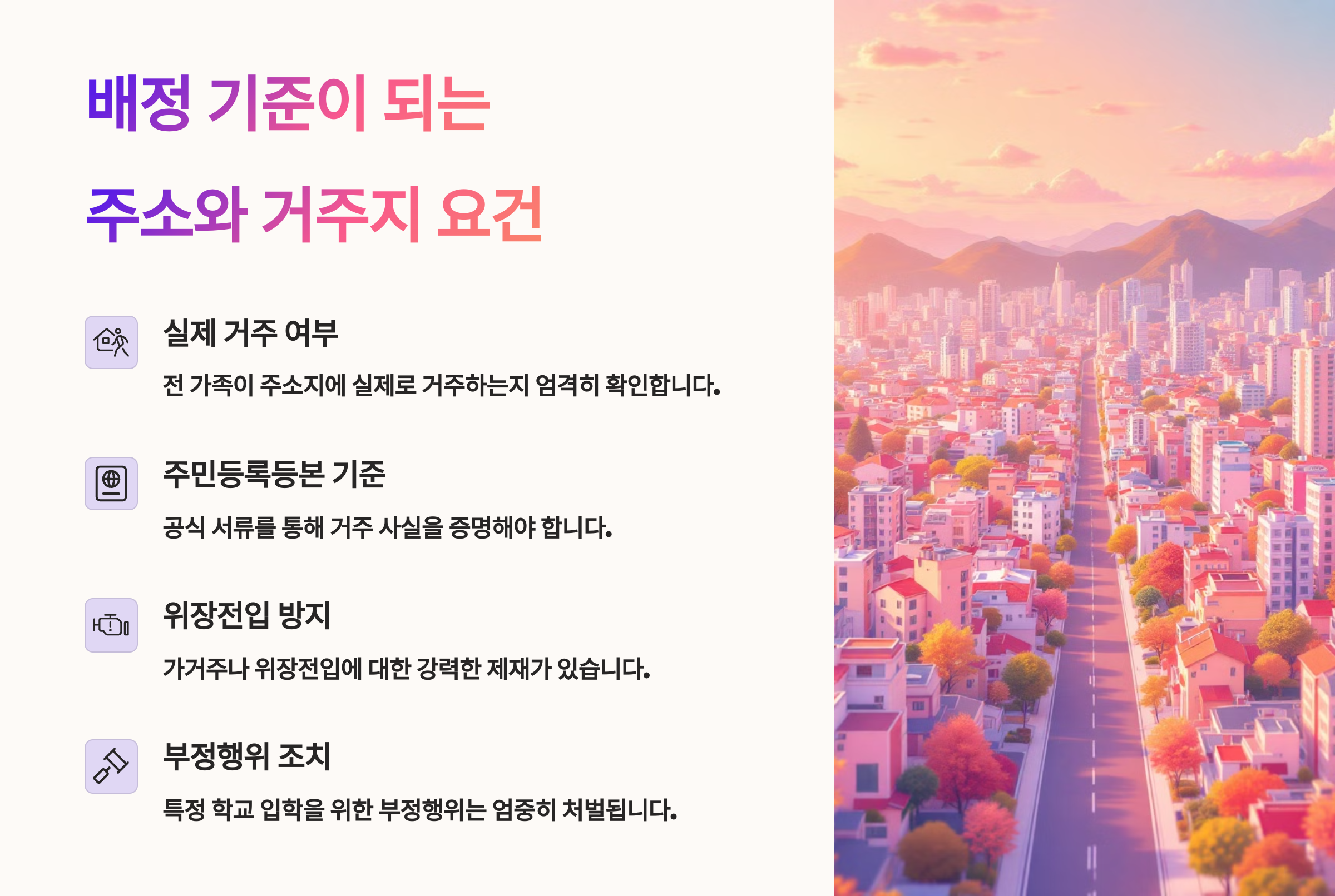 🏘️ 그리고 실거주 여부 확인을 위해 실제로 거주 중인지 확인하는 실태조사가 이뤄지기도 해요. 형식적인 주소 이전은 배정에 불이익을 받을 수 있으니 유의해야 해요.