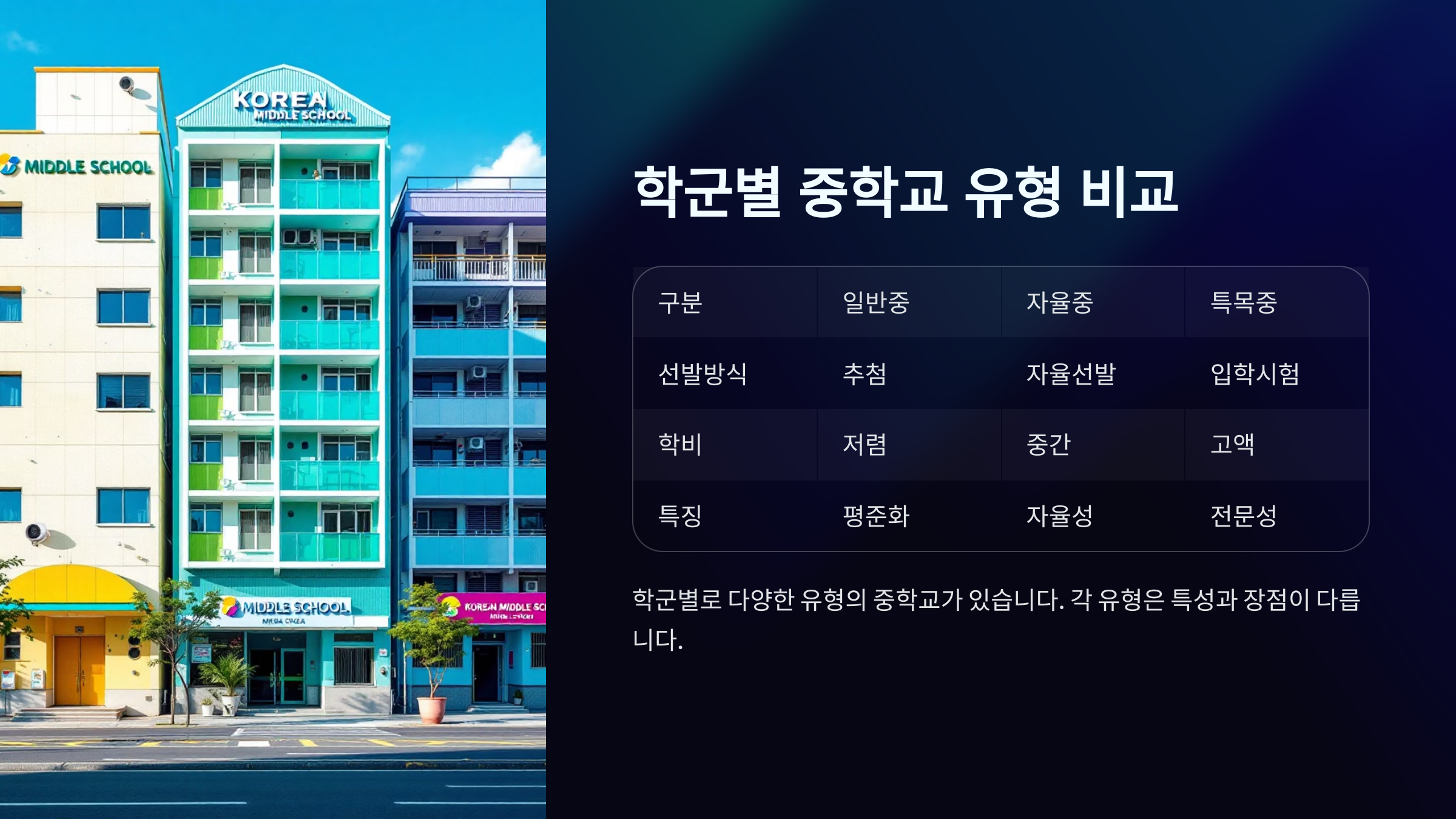 다음은 🏙️ 학군별 중학교 유형 비교 섹션이에요! 일반중, 특화중, 자율중, 통합형 중학교 등 내 아이에게 맞는 스타일을 찾는 데 도움이 될 거예요 😊📘